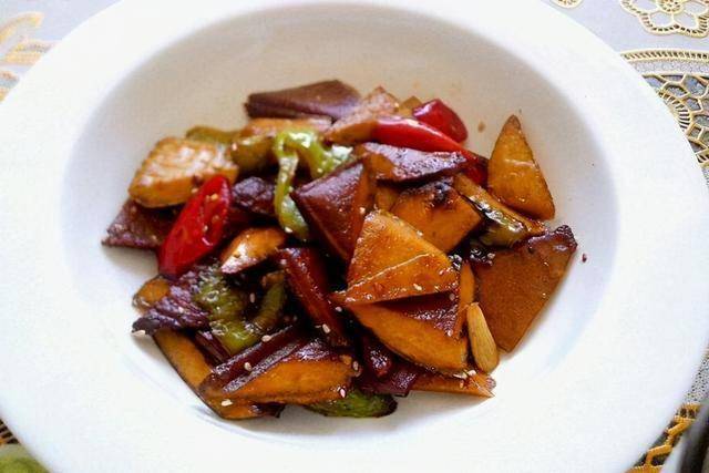 3、豆腐干煎膨松后,加入酱油和五香粉,再放入圆白菜,炒到稍软后,加盐和糖。倒入西红柿和火腿片,炒至西红柿稍出汤后即可关火。如汤水过多,调入少许水淀粉也可。