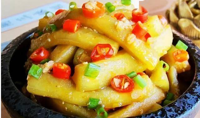 做法:1. 姜蒜切末、小米辣切圈、葱切花,茄子去头尾去皮,切长条,茄条切好迅速放入添加白醋的水中浸泡。