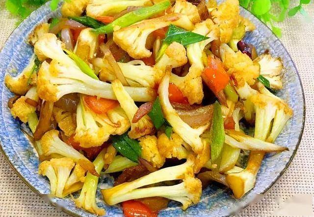 3.炒锅里倒入植物油,油热后放入菜花煸炒至菜花边缘焦糊,盛出备用。
