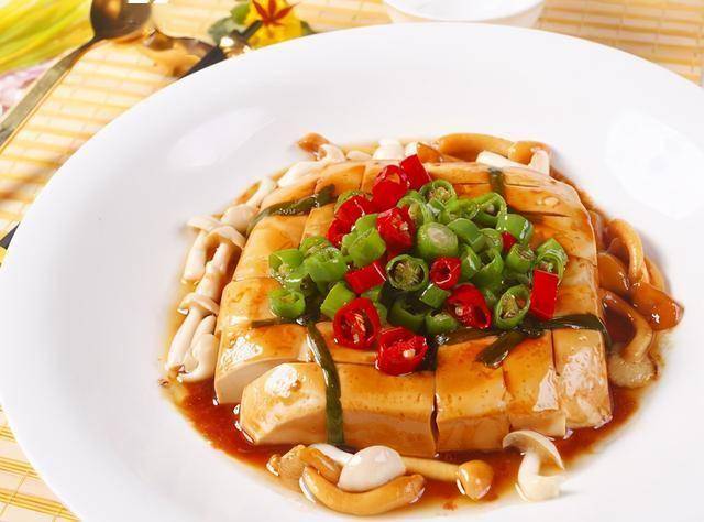 3、将柴鱼片、葱花洒在豆腐上方,淋上酱油即可。