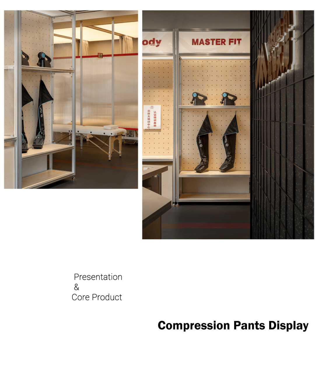 在MASTER FIT 深圳形象店中,我们对Therabody 旗下的产品以直观且专业的方式进行展示。其中将RecoveryAir 气压裤悬挂于木质展示板上,整齐排列的陈列方式不仅方便用户清晰看到产品外观,还能在视觉上形成有序、专业的观感。展示区域旁还配有醒目的品牌标识牌,强化品牌认知度。