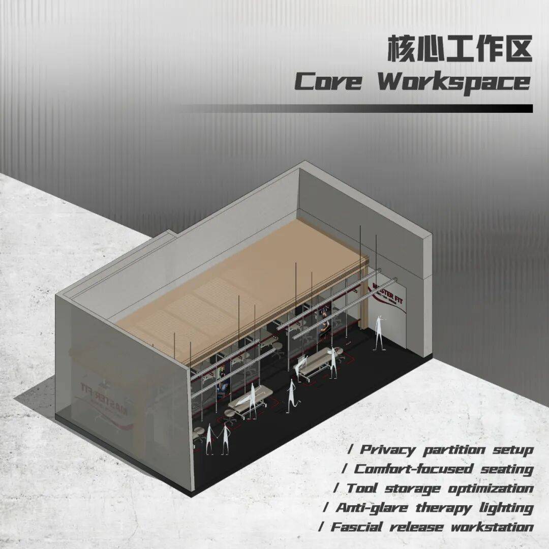 工作区是品牌核心服务的实施空间,也是用户深度体验“科学筋膜放松” 的关键区域。我们围绕 “服务效率提升”“体验舒适度保障”“专业价值传递” 三大目标,对收纳、隐私、照明、产品展示等维度进行精细设计,让每一处细节都服务于 “专业且有温度” 的康复体验。