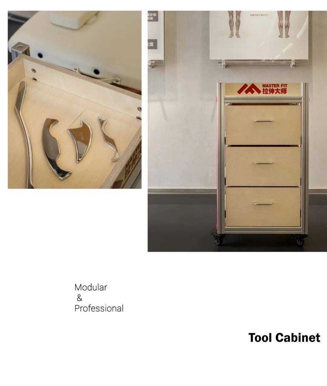 工作区配备专业收纳车,采用分层分区设计,精准适配筋膜刀、肌肉贴、按摩球等各类康复工具的尺寸与使用频率。常用工具放置于易取层,特殊工具则有序收纳于专属区域,既确保教练在服务过程中能快速拿取所需工具,提升服务效率,又通过规整的收纳方式,传递出品牌“专业、有序” 的服务理念,让用户直观感受到服务的规范性。