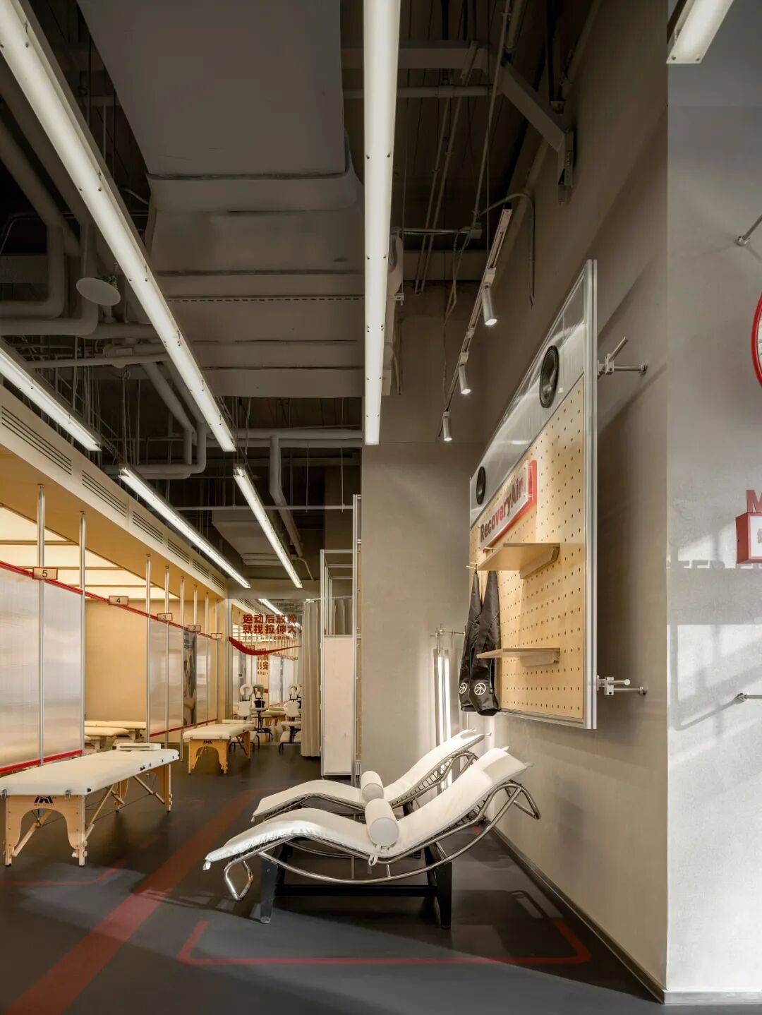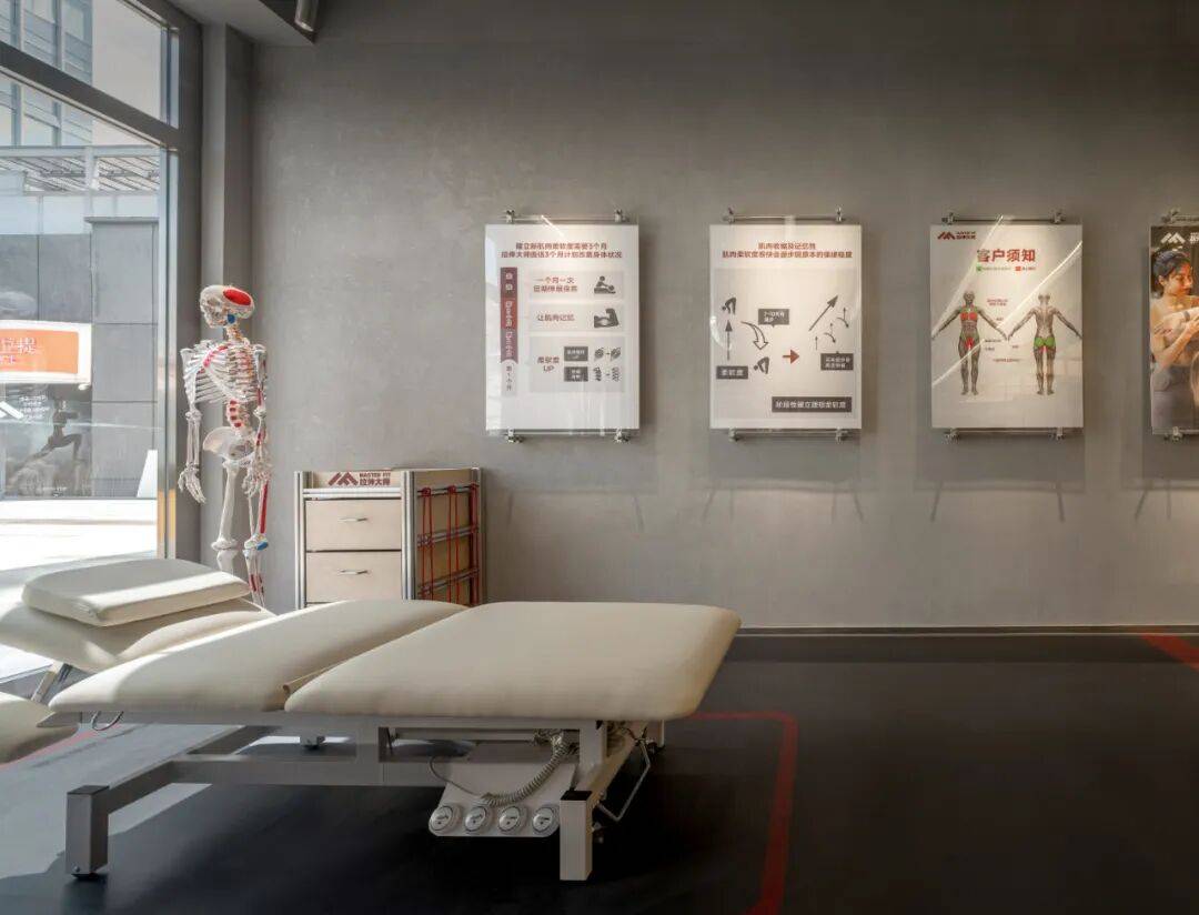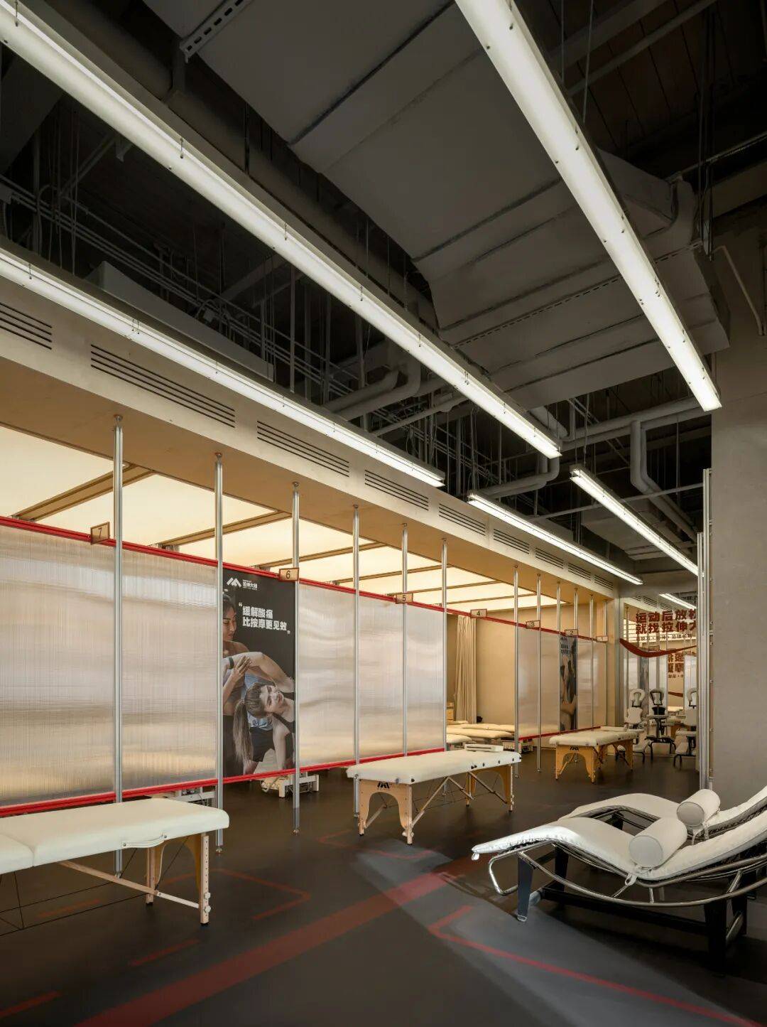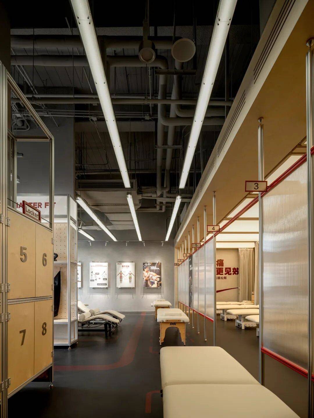 更深层的设计意图在于——通过环境暗示完成用户教育。例如,地面导视系统采用肌纤维走向纹理,天花板悬挂筋膜链模型,连储物柜把手都设计为神经突触形态。这些细节共同构成一套“非语言教学系统”,让用户在等待、更衣、休息时持续接收专业信息,潜移默化强化品牌权威形象。