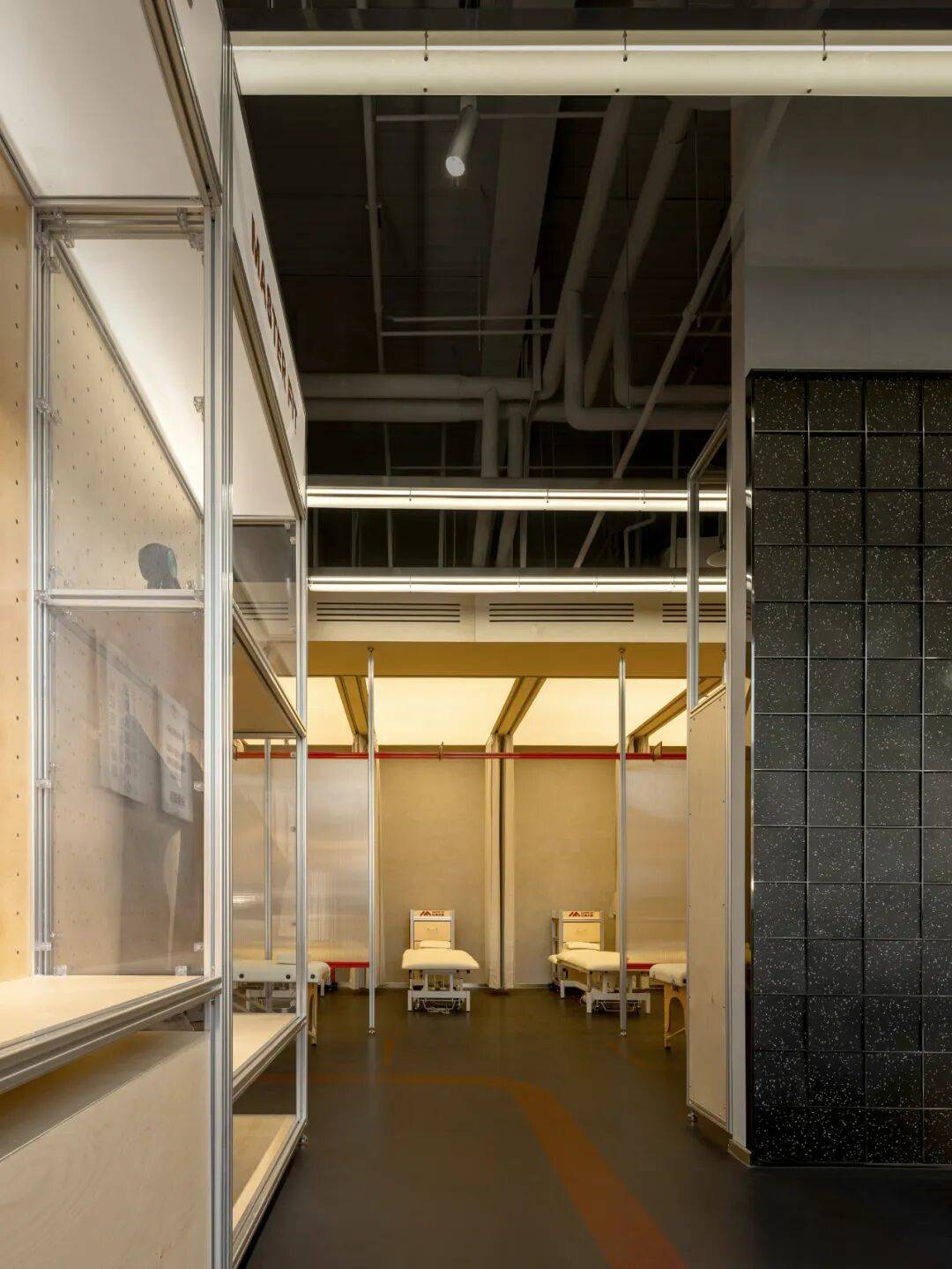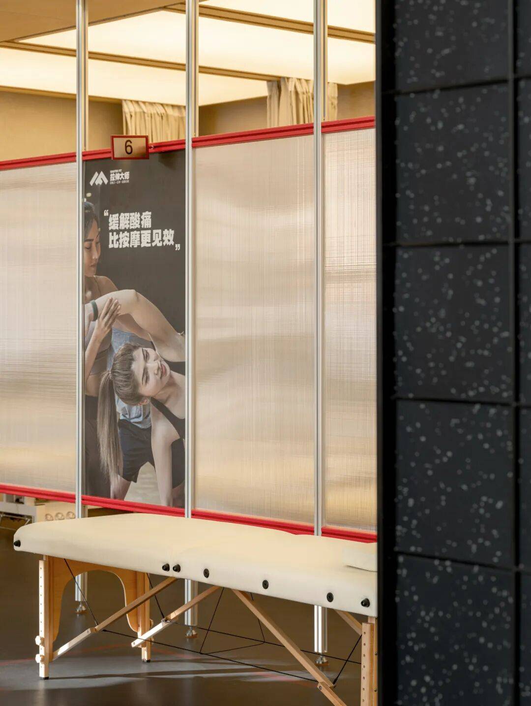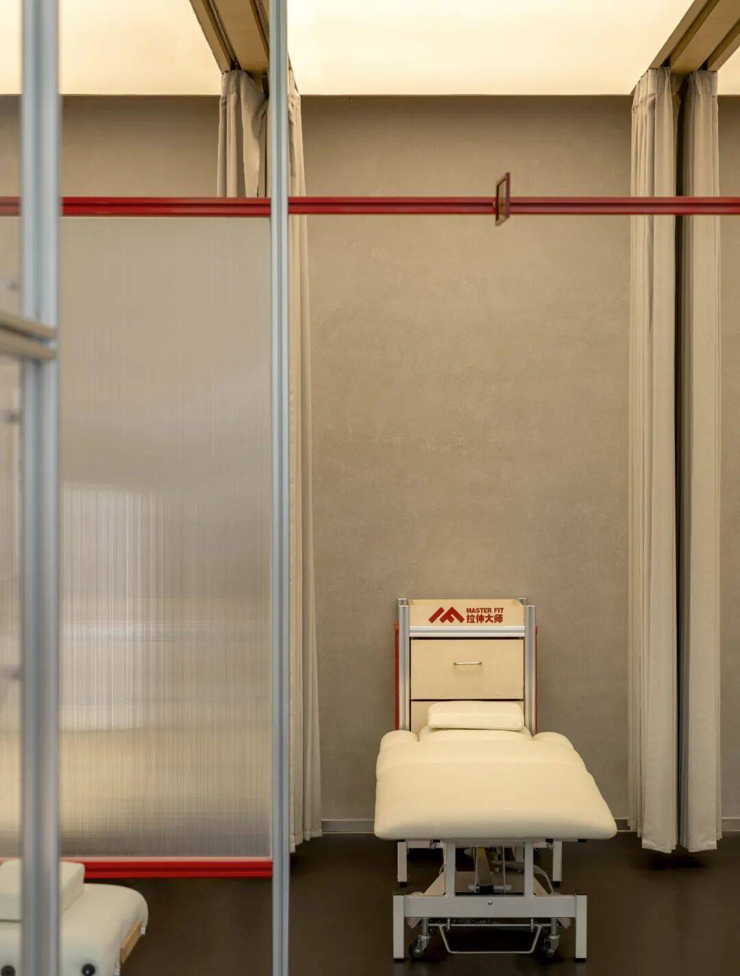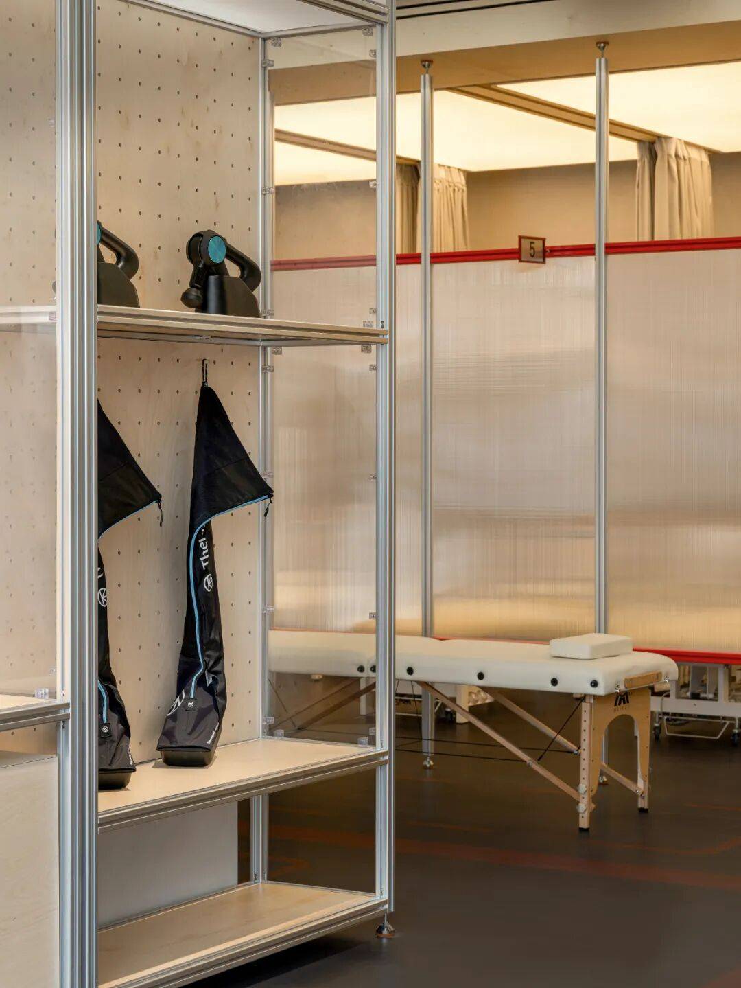 更深层的设计意图在于——通过环境暗示完成用户教育。例如,地面导视系统采用肌纤维走向纹理,天花板悬挂筋膜链模型,连储物柜把手都设计为神经突触形态。这些细节共同构成一套“非语言教学系统”,让用户在等待、更衣、休息时持续接收专业信息,潜移默化强化品牌权威形象。