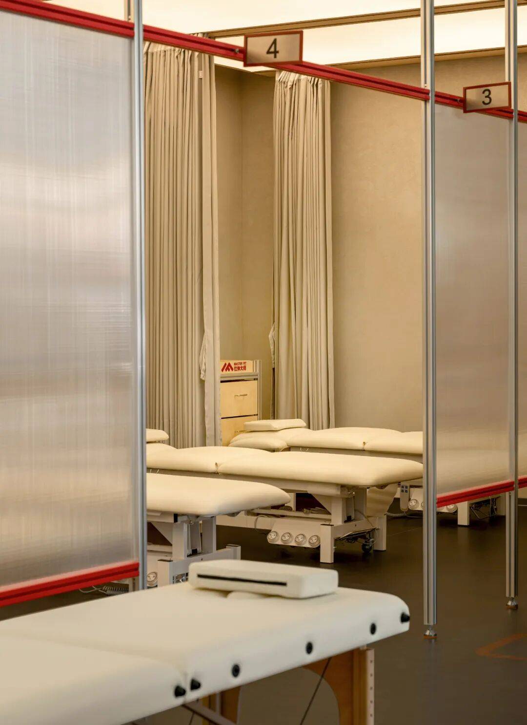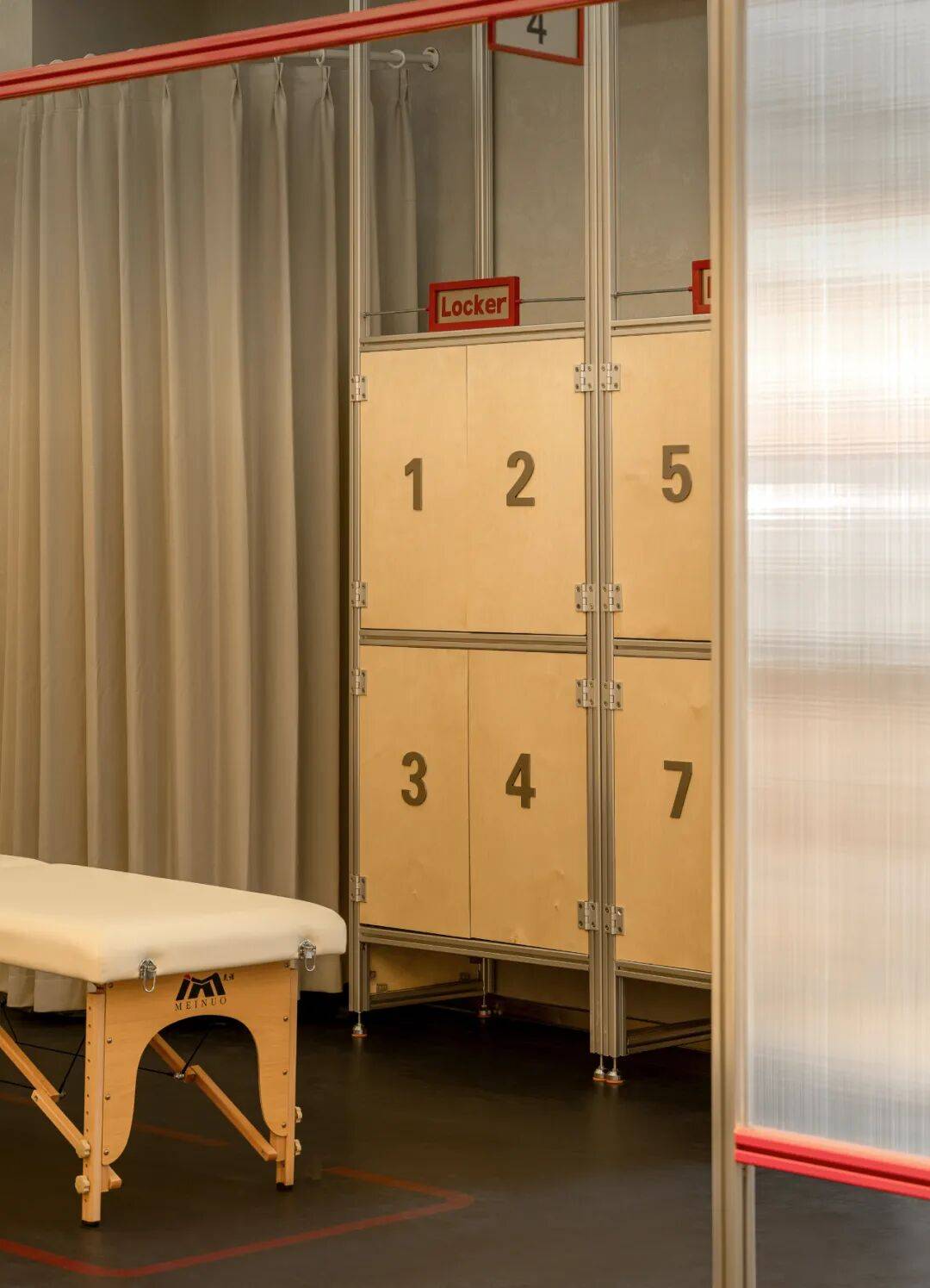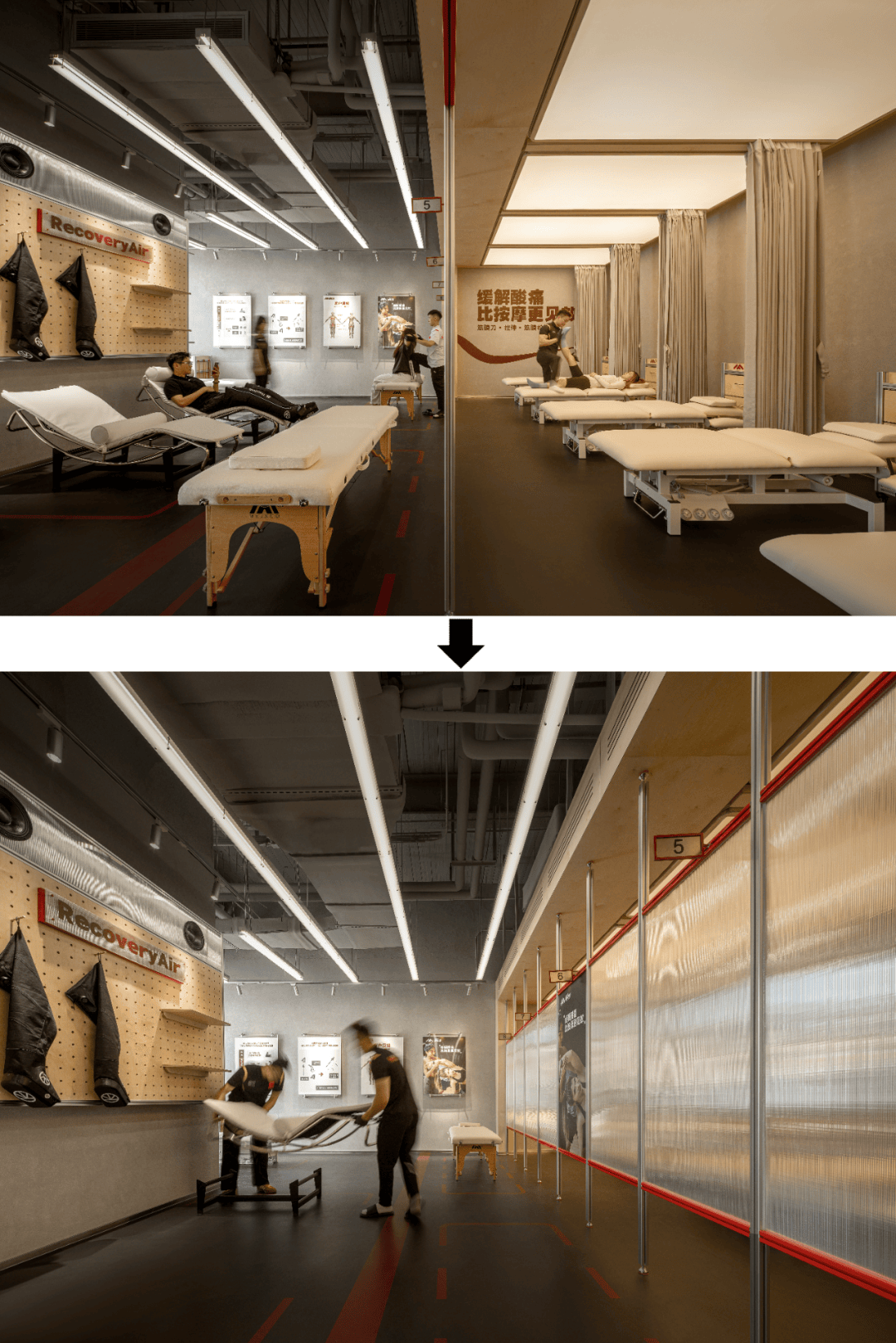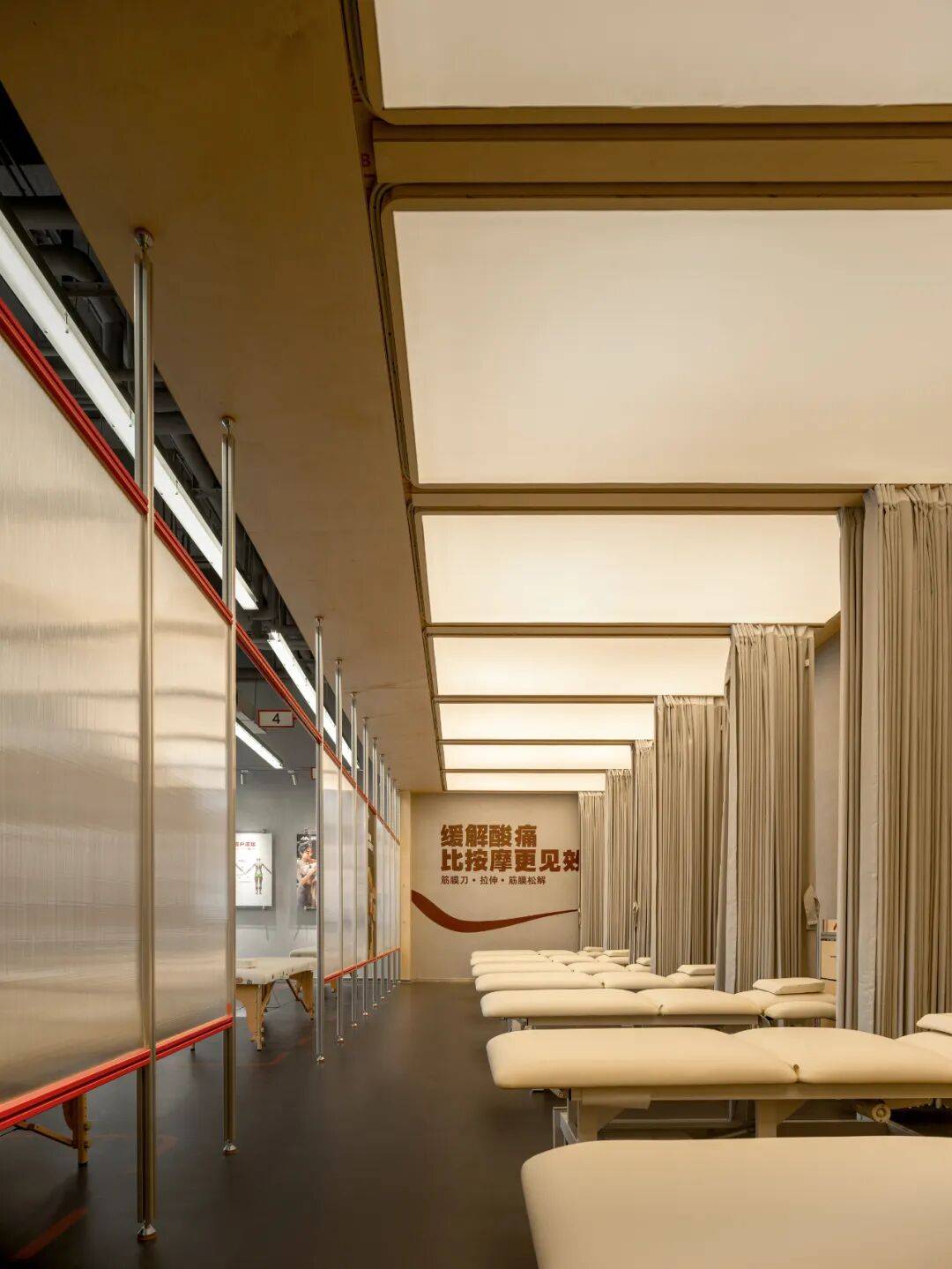 更深层的设计意图在于——通过环境暗示完成用户教育。例如,地面导视系统采用肌纤维走向纹理,天花板悬挂筋膜链模型,连储物柜把手都设计为神经突触形态。这些细节共同构成一套“非语言教学系统”,让用户在等待、更衣、休息时持续接收专业信息,潜移默化强化品牌权威形象。