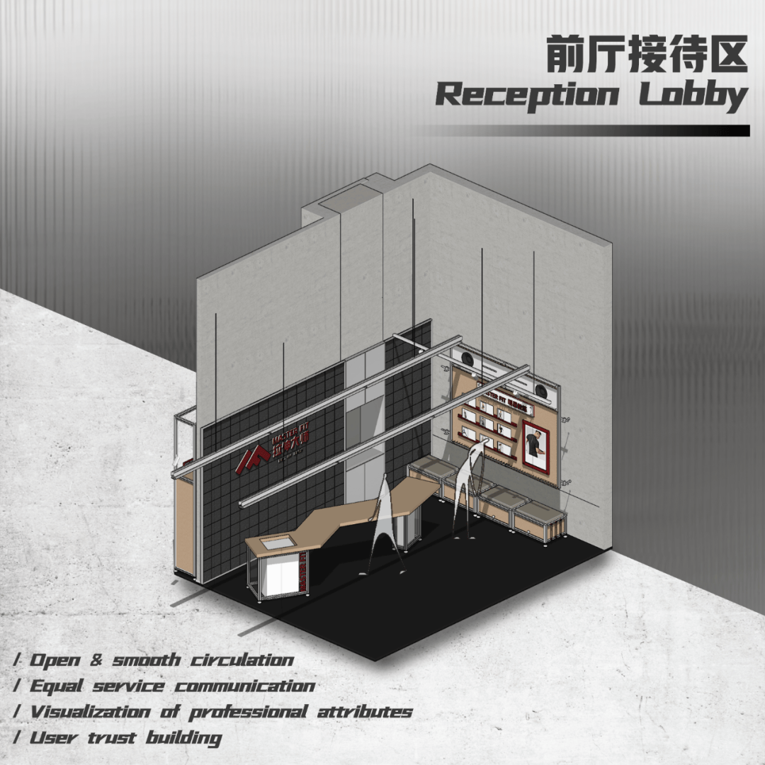 前厅接待区以“消解距离感,强化交互性” 为核心,通过空间与功能的创新融合,打造开放且具社交属性的服务场景:接待台打破传统柜台的封闭感,采用通透化、轻量化设计,弱化服务边界的物理隔阂。