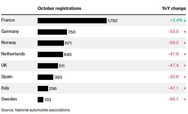 除法国外,特斯拉上月在欧洲的销量大幅下滑。