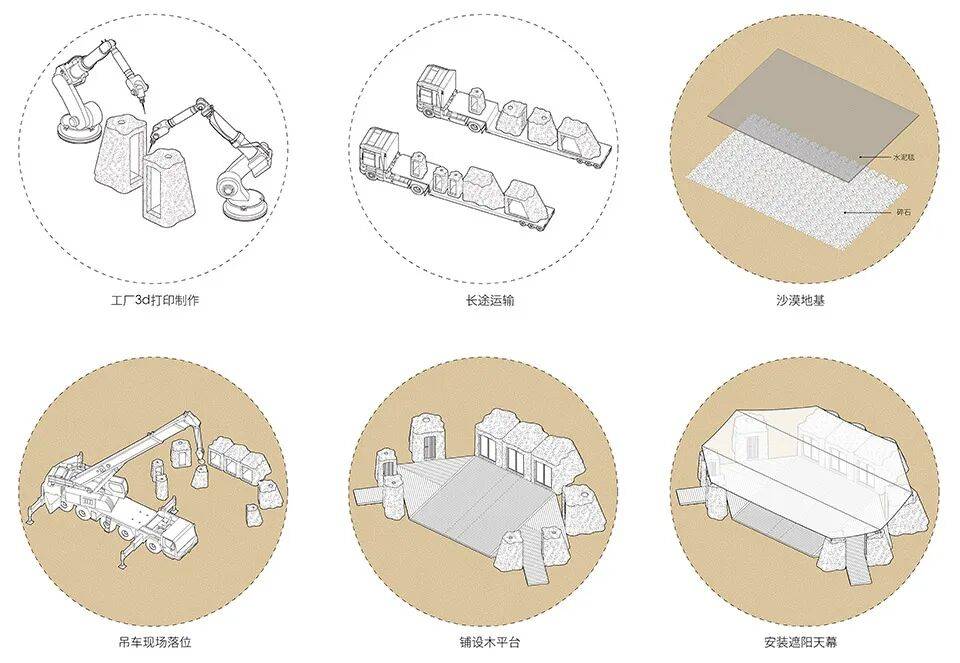 余留地的目标是创造一个既足够坚固耐候,又反映环境特质的可装卸建筑系统。考虑到沙漠严苛的施工条件,转瞬即逝的窗口期,以及极端气候下建筑材料的耐久性和持续维护的成本,设计团队采用三维混凝土打印的方式(清华大学徐卫国教授团队提供技术支持)实现快速建造。整个营地包含公共活动室,厨房,卫生间,淋浴间和仓库。通过化整为零的策略,各功能分散到模块化的空间单元之中。所有单元在工厂中预制完成,空间与结构一体设计,尺寸与荷载经过精心优化,满足沙漠中运输和吊装的限制。尽管遇到异常天气,现场落位和安装主体空间单元仅用了两个工作日。