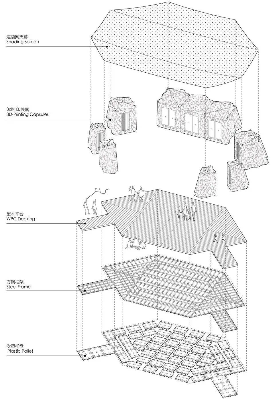 材料:三维打印混凝土,塑化木地板,吹塑托盘,高强度纤维遮阴网,太阳能板,电池
