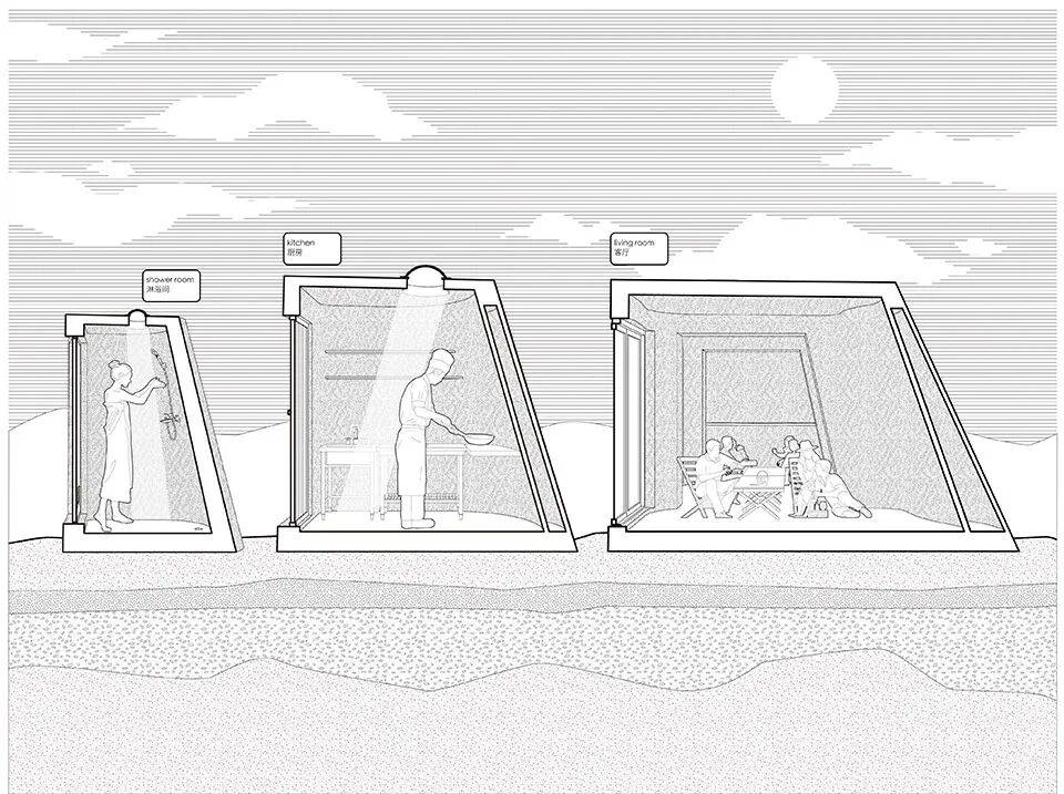 较之于该地区常见的预制建造体系,如木屋和集装箱,三维打印混凝土墙体的空腔具有更优良的保温隔热性能。余留地设计团队希望为植树者创造有舒适度的临时栖息所,同时保持对沙漠自然力量的敬畏。最理想的是,当营地“过期”后,它能够复归于沙土,不留下有形的建筑垃圾。三维打印混凝土本质上是聚沙成塔,且较其它预制混凝土构件更易于优化体量,适应远程投放和快速组装,无需永久性、大开挖的地基。流线型的墙身设计有助于减少建筑的风阻,也力图使营地融入沙漠起伏的地景,采取一种与环境同频,而不是争奇的姿态。