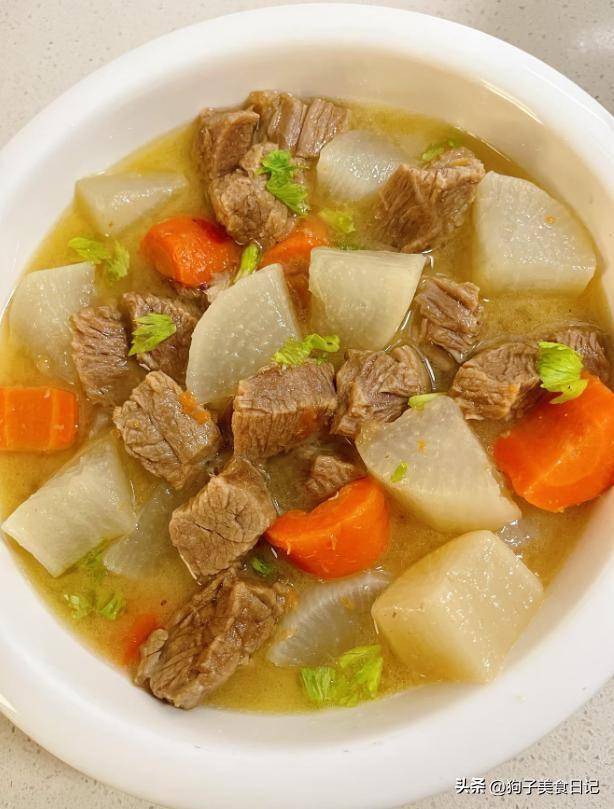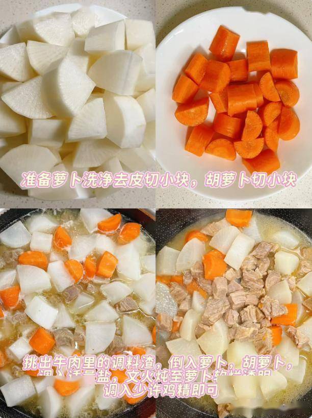 6. 加入白萝卜和胡萝卜块,继续炖30分钟,至萝卜熟透。