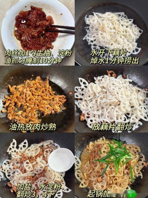 1. 莲藕去皮切薄片,用清水浸泡去除多余淀粉;猪肉丝用少许生抽、水淀粉腌制10分钟。