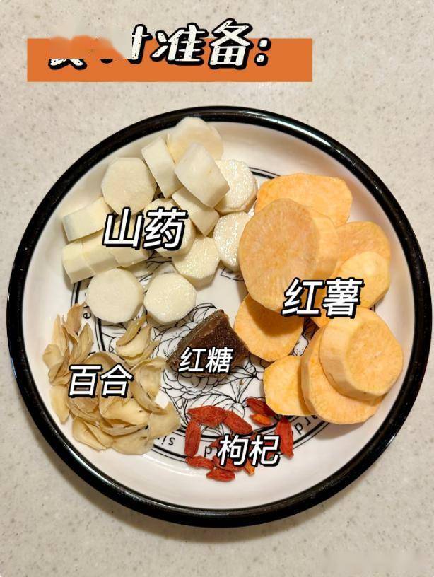 1. 山药、红薯去皮切小块;百合洗净;枸杞用温水泡软。