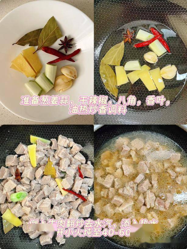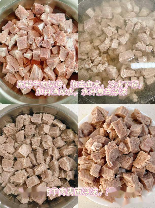 1. 牛肉切成3厘米见方的块,冷水下锅,加入姜片、料酒焯水,撇去浮沫后捞出沥干。