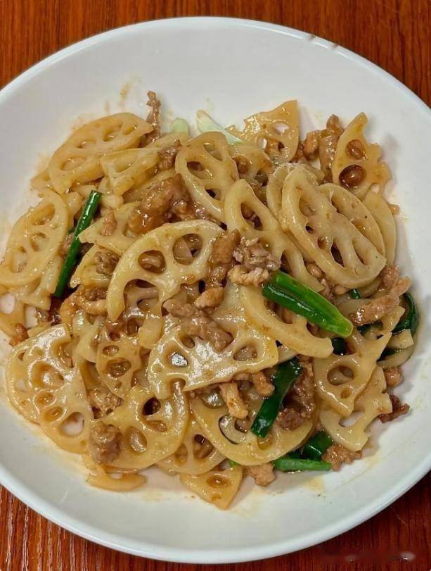 3. 锅中再加少许油,放入葱段爆香,倒入莲藕片大火翻炒2分钟。