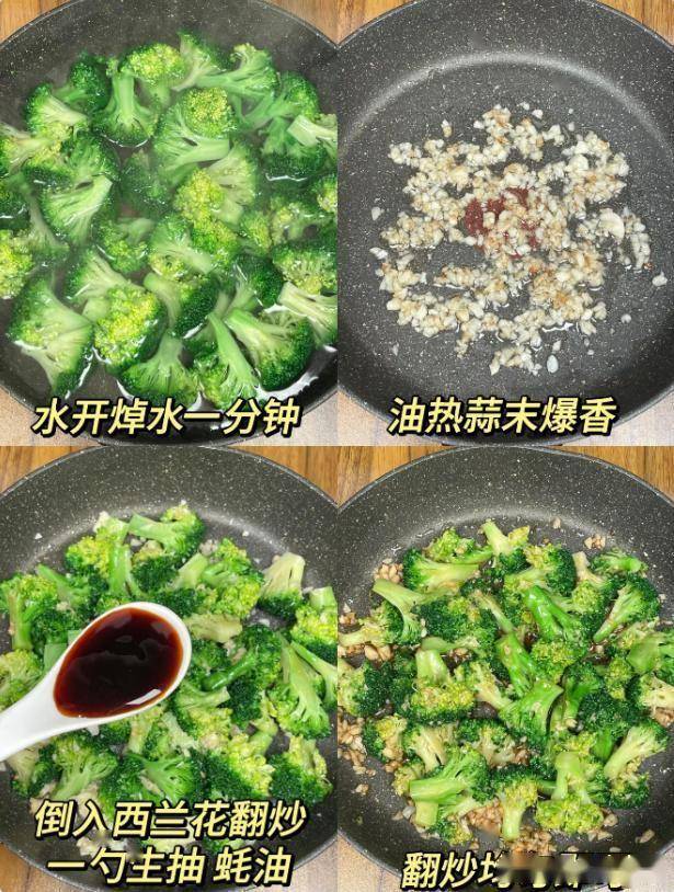 4. 放入焯好的西兰花大火翻炒1分钟。