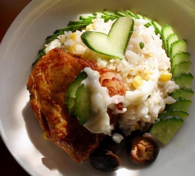 4、黄瓜洗净后切片,撒少许盐,最后把米饭、鸡肉、黄瓜(或者其他配菜)组合起来,挤上美乃滋(或浇汁)