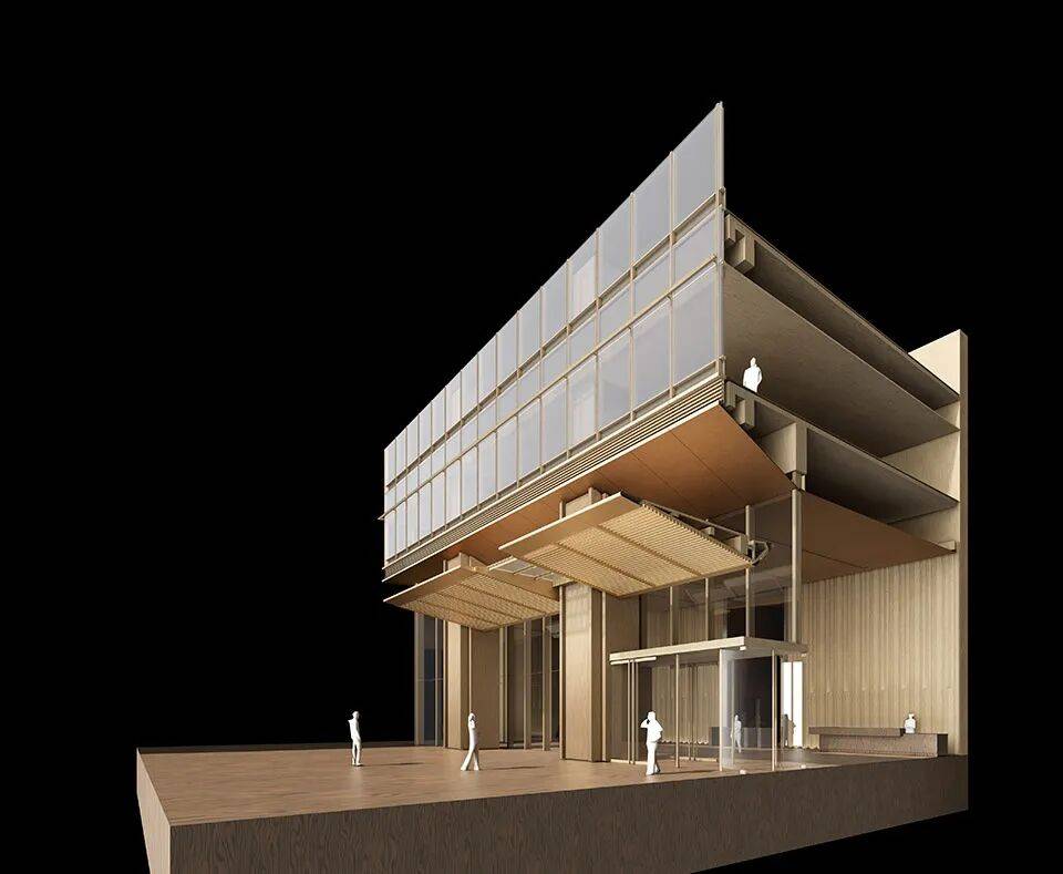 通过延续体块划分逻辑,在西侧城市界面上,如“视窗”般的玻璃体量形成逐级上升的错落关系,从而形成呼应。山墙面四个柱子突显,从底到顶“支撑”玻璃体量,强化极具辨识度的造型关系。