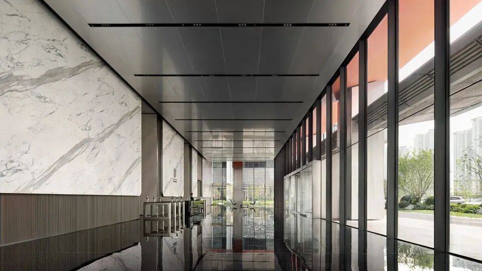 造价的分配:占主要立面的标准段要极限地将造价控制,才能在底部等近人尺度的地方用更好的材料提升效果。标准段框架式,以金属开启扇调节玻璃尺寸(≤4㎡)并增加层次,上下单元的脱离降低了对施工平整度的要求。大堂区域设计采用夹胶超白玻璃,相对中空玻璃能降低造价,同时提升大堂的通透观感。室内采用T型精致钢立柱,弱化内侧体量感。同时,精致钢承担门斗的部分竖向荷载,以此取消门斗钢立柱。主入口立柱以约9米通高铝复合板覆面,两柱之间外挑不锈钢雨棚,形成丰富的空间关系。