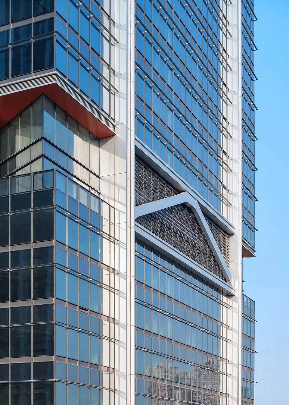 建筑造型简约现代,结合避难层进行形体划分,呼应“视窗”整体概念;两侧山墙面设置装饰立柱,与200米超塔形成层层叠落的空间关系;