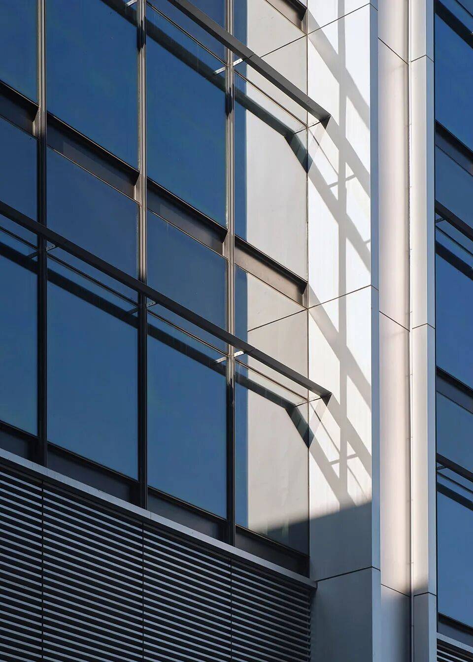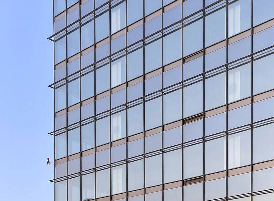 为了最大化办公区域的视野并保证幕墙的完整性,立面采用夹胶中空玻璃,取消防护栏杆。同时把开启扇设在底部,避免了开启对外立面的影响。