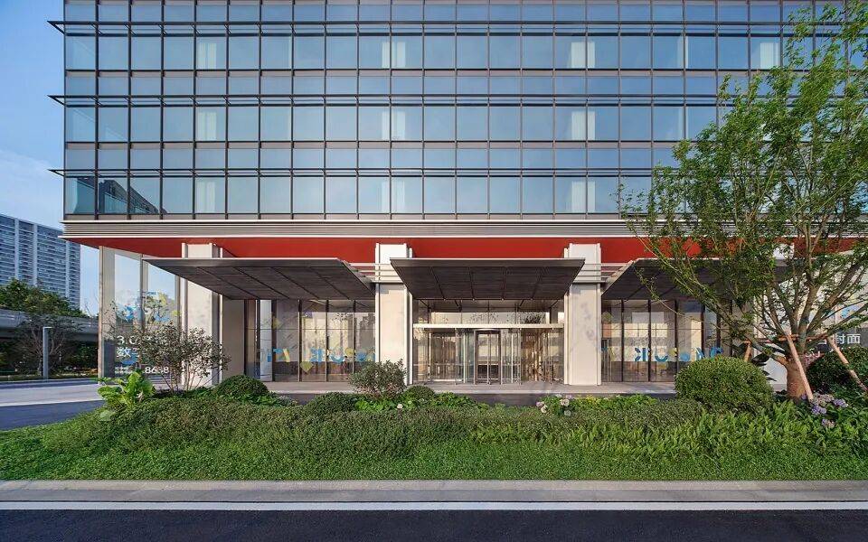 建筑立面采用横明竖隐框架式幕墙,底部采用铝板内开启扇,满足室内通风要求;办公大堂两层通高,立面选用超白夹胶玻璃,创造通透开放的社交空间。