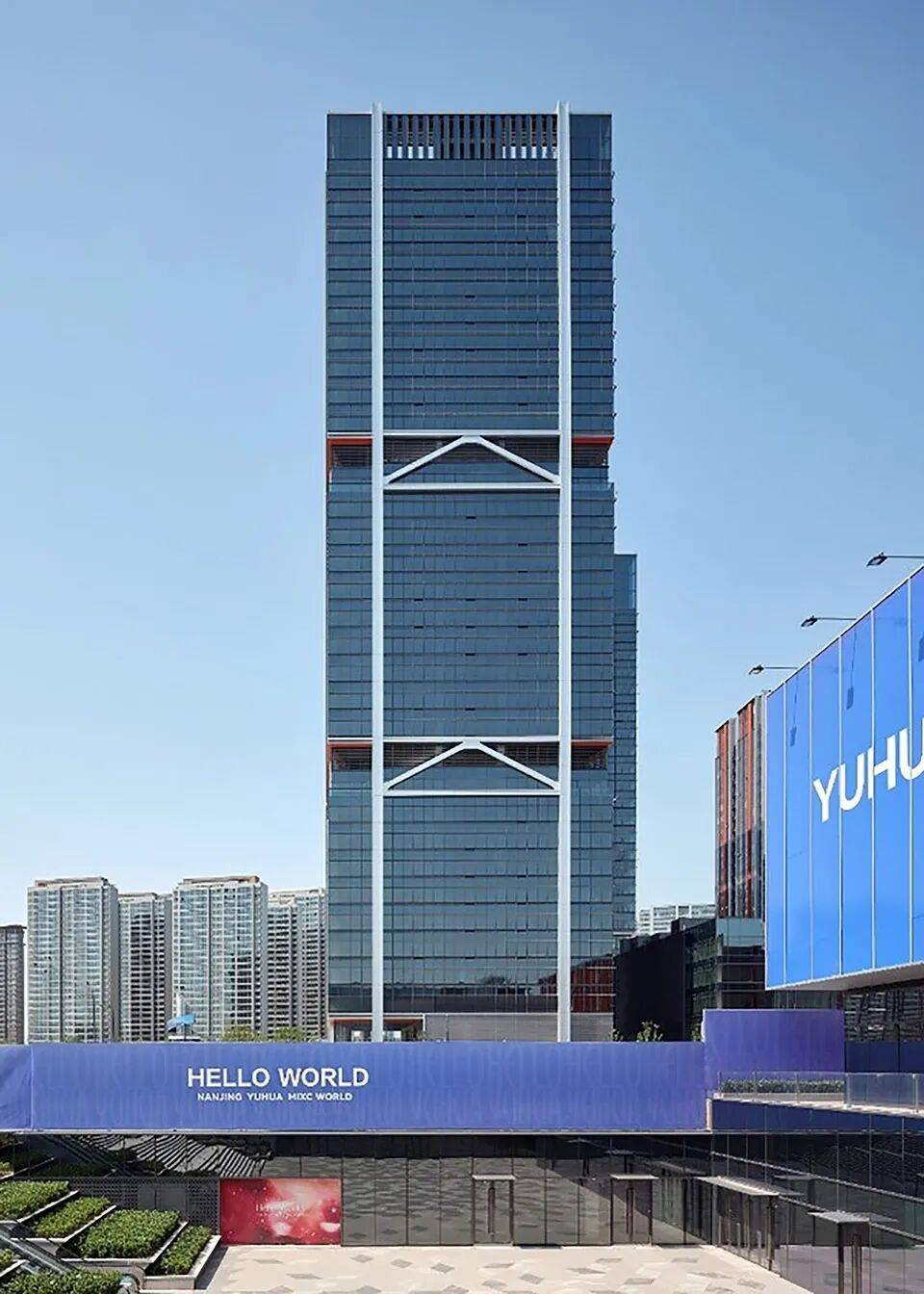 山墙的柱子并非只是装饰,而是结构结合造型,取消传统转角部必需的结构柱,两侧分别留出约9米的玻璃界面,使每层转角形成270度无遮挡景观面,几乎消弭建筑表皮的“边界感”,重新定义了南京高层办公的空间。