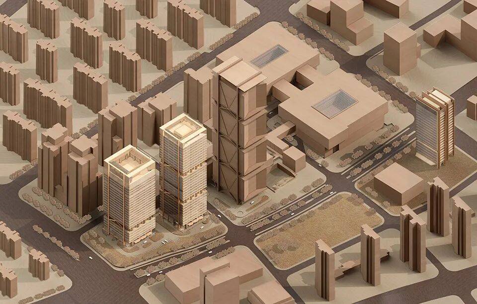 尽管两者美学取向迥异,但均遵循清晰的几何逻辑与结构表达,在视觉上形成“刚劲”与“轻灵”的对比。这种差异并未造成冲突,反而通过高度控制、退让间距与轴线呼应,在城市天际线中达成一种“异质同构”的和谐。双塔的对称布局与未建塔楼的单体中心性形成“群像”与“孤峰”的互补,丰富了空间叙事层次。