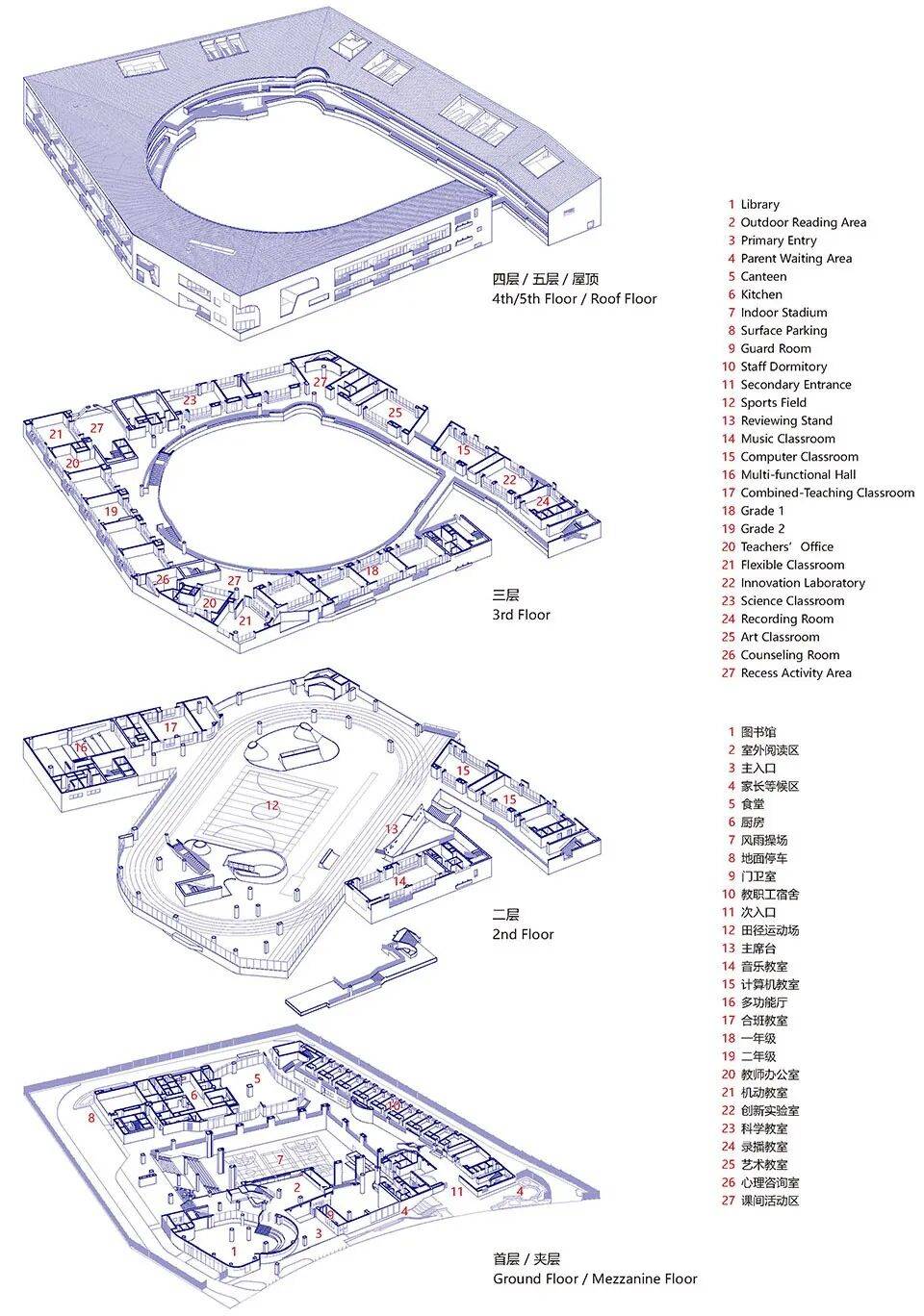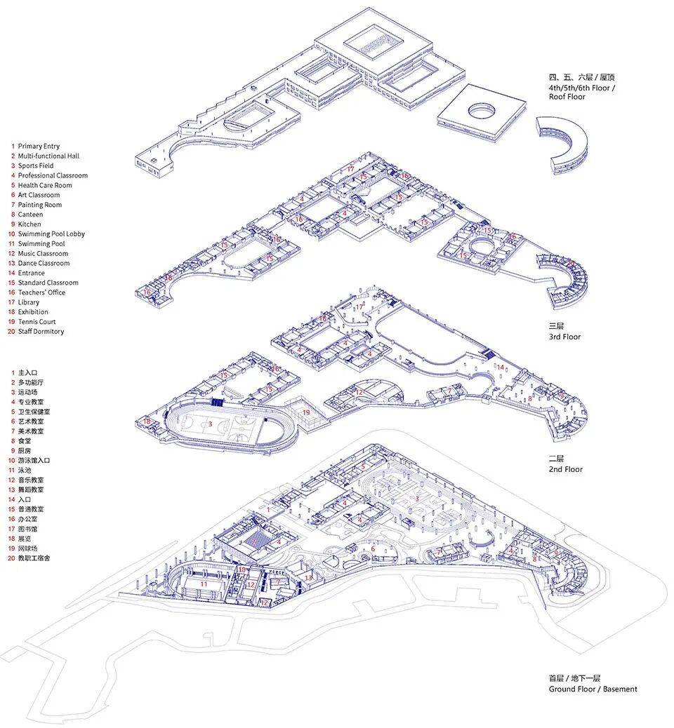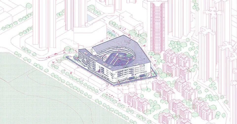 围屋学社场地形状不规则且周边高楼环伺,外折内圆的平面形态将基地使用最大化,设计策略回应高密度环境的同时,力图缝合碎片化的空间肌理并重新植入社区的文化与精神性内核。在强调上部围合的同时,将学校与社区可共享的文体功能置于底层。中心大面积的运动场可为社区提供大型活动的舞台空间,增强社区凝聚力。建筑语言从客家民居中汲取灵感,结合本地气候与学校的功能需求,多元的立面语汇回应了高密度校舍在遮阳、通风以及私密性与开放性等方面的问题。