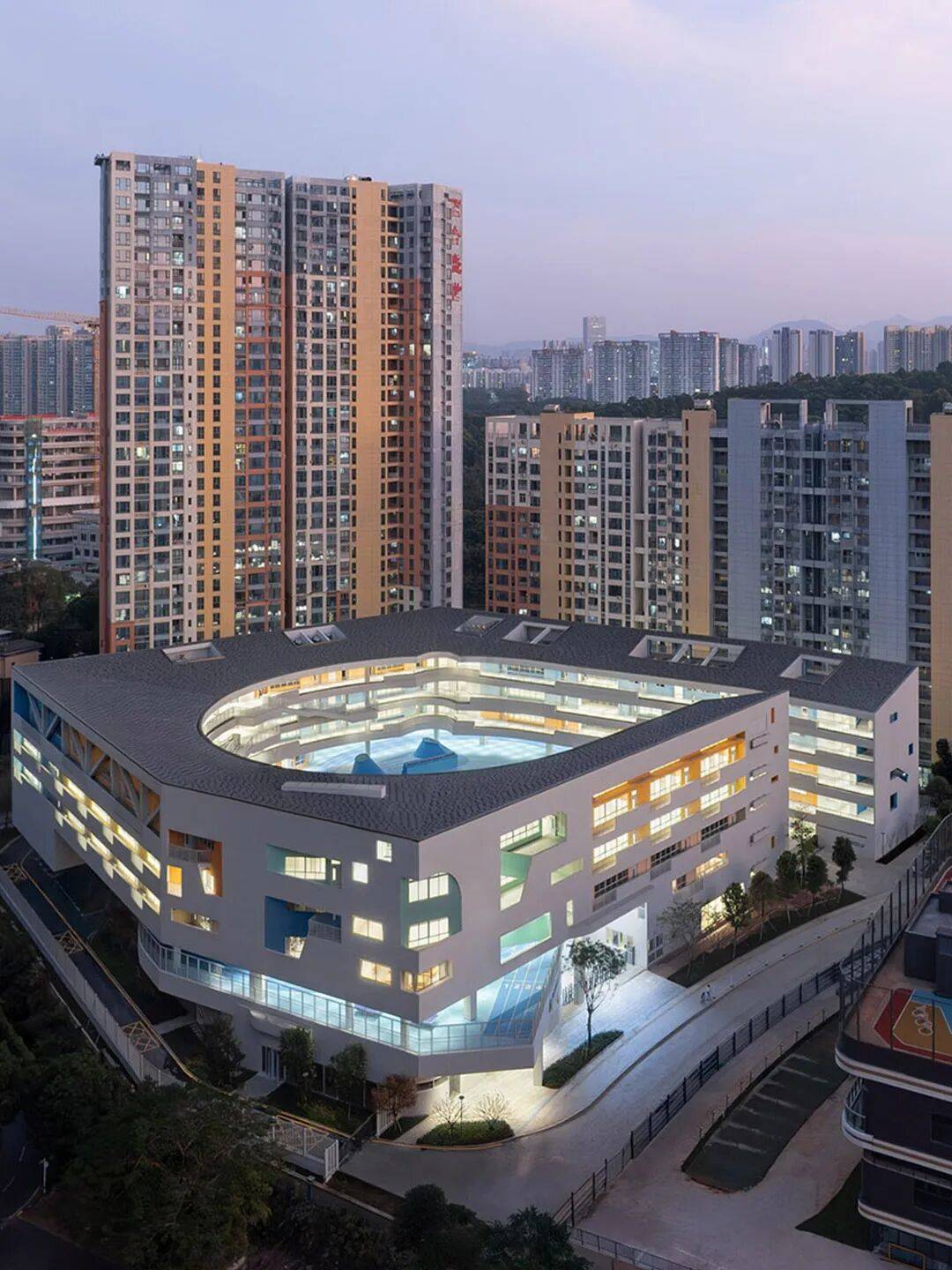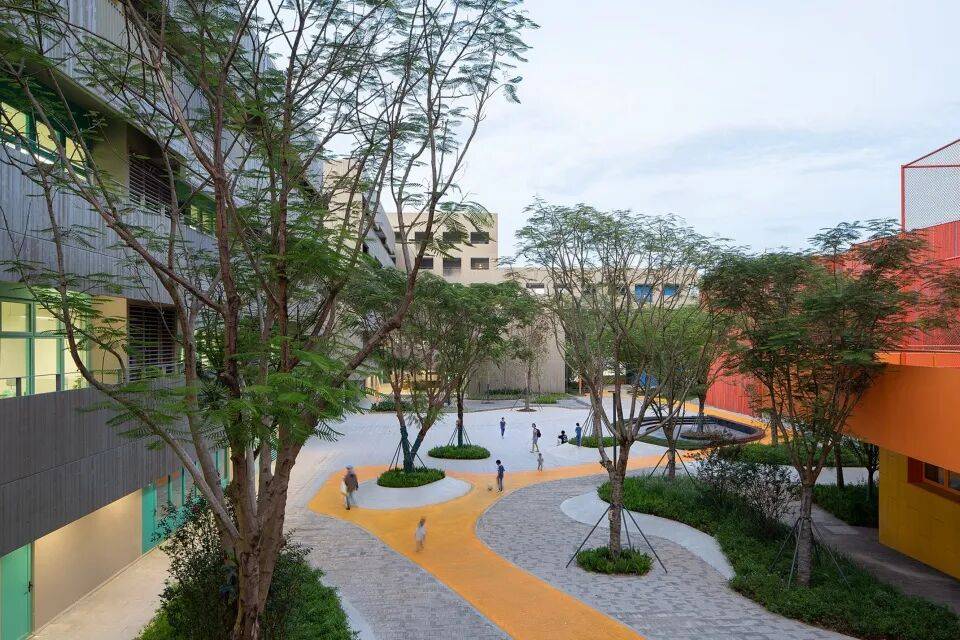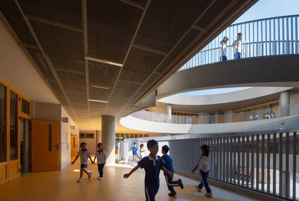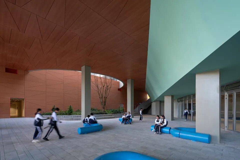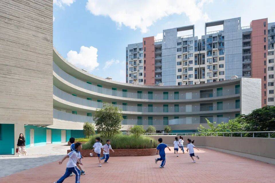 围龙书院以客家围屋式的连续水平体量回应周边城市的超大 尺度和过度垂直性。通过基地边界密度的叠加,营造围合的书院体量,给学校内部让出了岭南园林般丰富的庭园空间。沿场地边界共享功能空间、在首层对城市开放骑楼街道界面以及向社区开放廊道,形成了学校与社区交互的复合界面。设计创造性地提出“书院单元+游廊聚落”的空间模式,将传统围屋的院落体系解构为几个独立书院单元,对应不同学段的教学需求。低年级书院以圆形的坡道环路与趣味性空间激发探索欲望;中年级书院通过开阔的拼色运动庭院鼓励活泼自由的奔跑; 高年级书院则是通过静谧的庭院与植被,营造专注与交流并重的学习氛围。