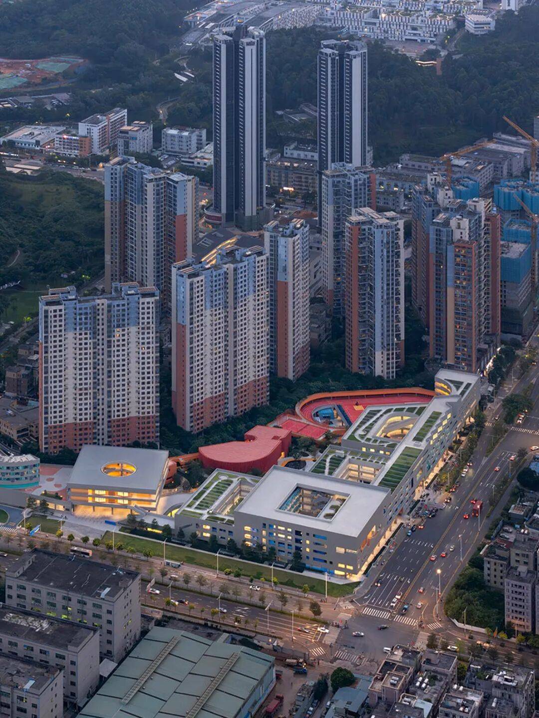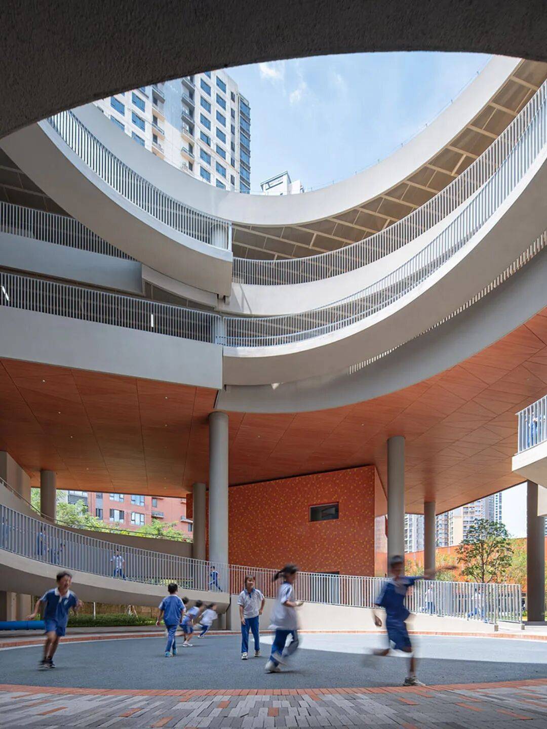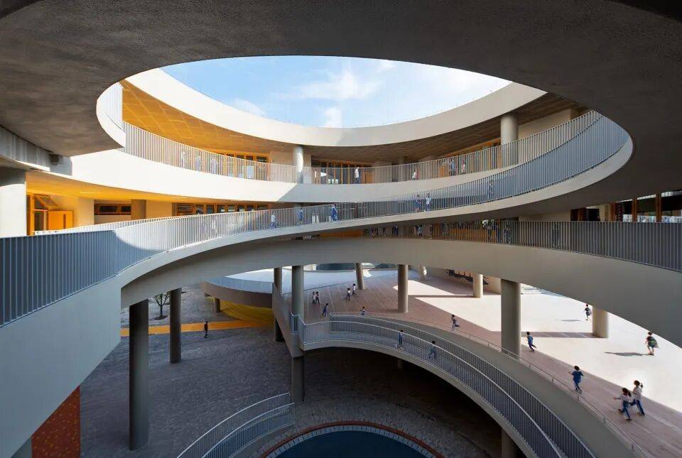 围龙书院以客家围屋式的连续水平体量回应周边城市的超大 尺度和过度垂直性。通过基地边界密度的叠加,营造围合的书院体量,给学校内部让出了岭南园林般丰富的庭园空间。沿场地边界共享功能空间、在首层对城市开放骑楼街道界面以及向社区开放廊道,形成了学校与社区交互的复合界面。设计创造性地提出“书院单元+游廊聚落”的空间模式,将传统围屋的院落体系解构为几个独立书院单元,对应不同学段的教学需求。低年级书院以圆形的坡道环路与趣味性空间激发探索欲望;中年级书院通过开阔的拼色运动庭院鼓励活泼自由的奔跑; 高年级书院则是通过静谧的庭院与植被,营造专注与交流并重的学习氛围。
