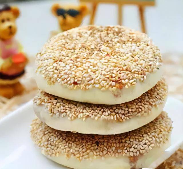 4.平底锅不放油加热,芝麻面向下,把面坯放入,小火烙制,两面烙制金黄,即可出