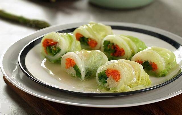 1. 白菜叶焯水30秒变软,切去硬梗。
