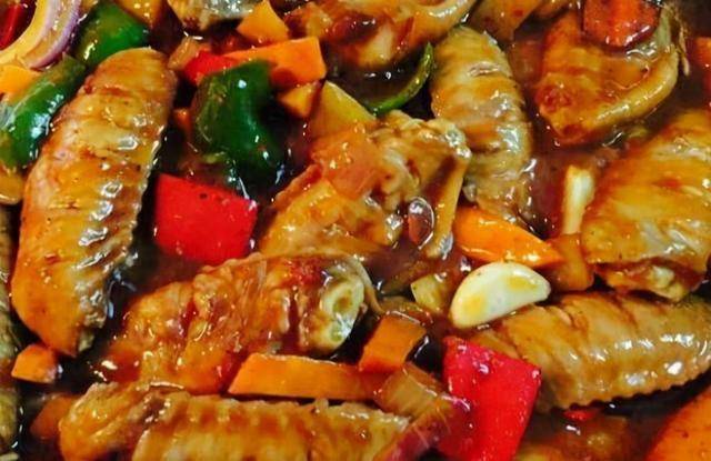材料:鸡翅600g 青椒3个 红椒3个 土豆一个 洋葱适量 红萝卜适量 蒜2个 蚝油2勺 番茄酱2勺 黄豆酱2勺 酱油2勺 糖1勺 鸡精1勺 淀粉1勺 辣椒油适量 胡椒适量 辣椒粉适量