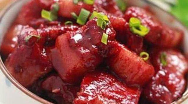 将炒锅烧热,倒入洗干净的五花肉,大火翻炒2分钟左右,炒至变色,加入2大勺料酒,继续翻炒半分钟左右。加入红腐乳汁翻炒均匀,冲入热开水(水面超过肉面)。滚开后转小火,盖上盖子,焖煮约1个小时,炖至汤汁稀少时,开大火,将最后的汤汁收干,撒点鸡精和葱花,拌匀盛出装盘即可。