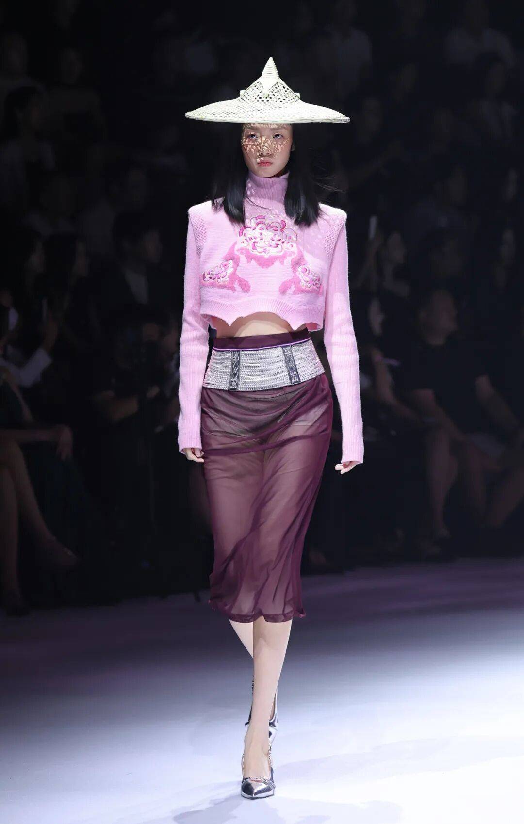 黄斗笠轻垂薄纱,现代廓形呼应,