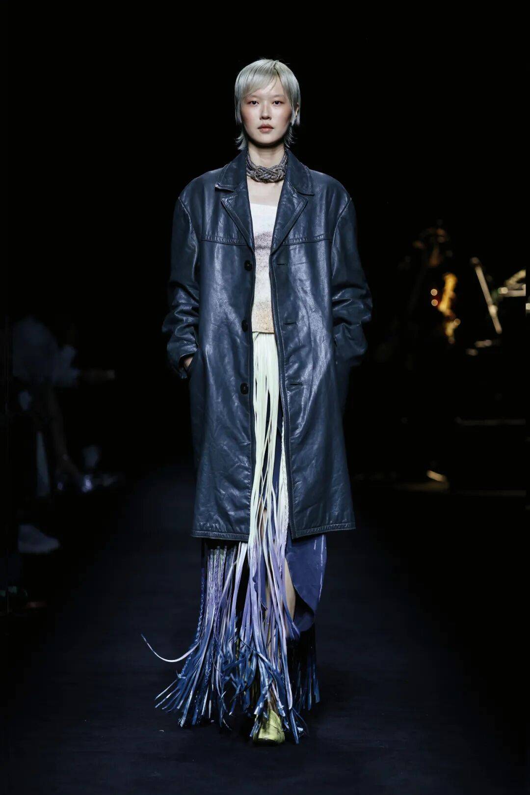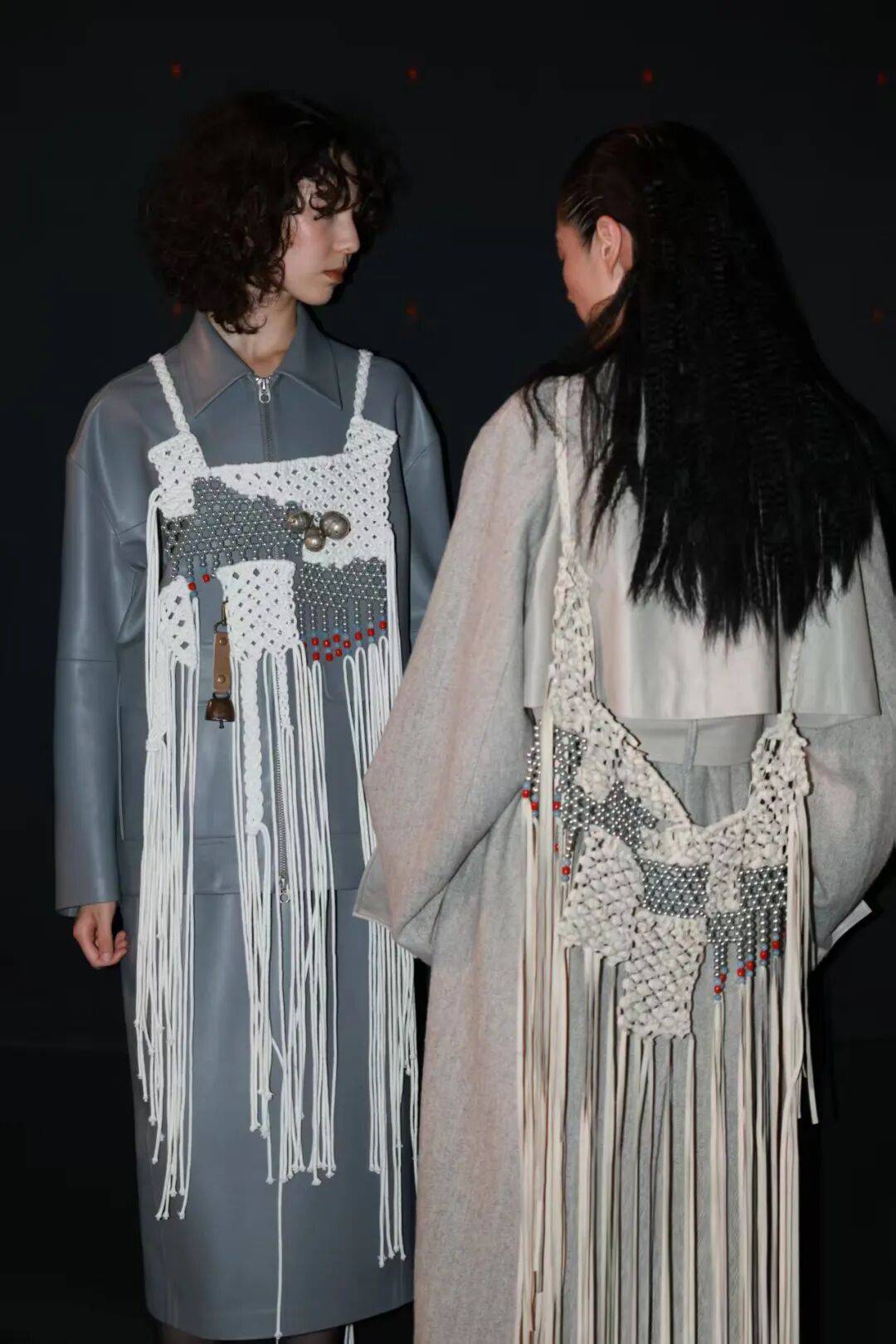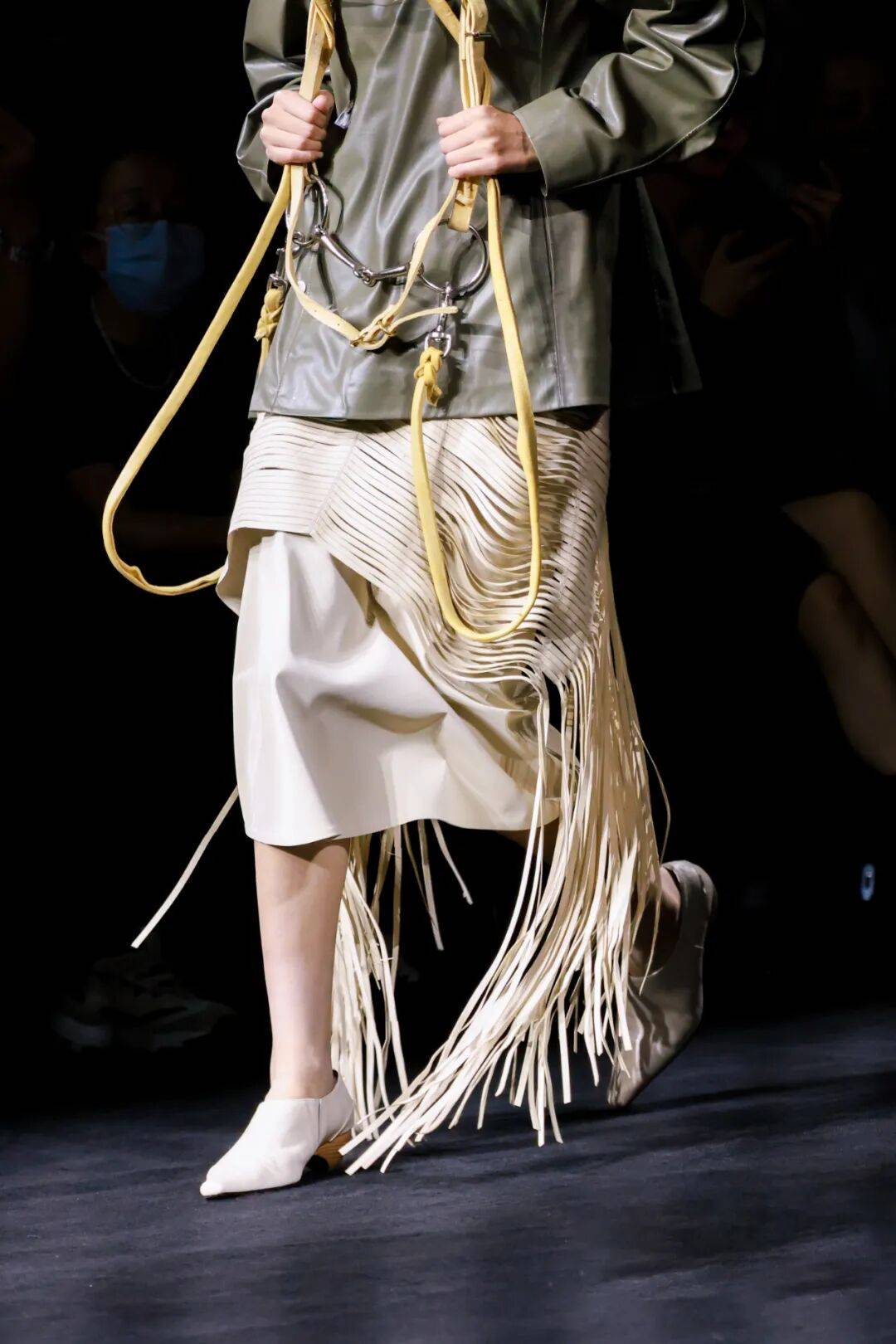 本季设计中,大廓形的biker jacket、bomber jacket和trench coat明显偏向实用主义。在前卫的表象之下,“Balance”平衡感和“Harmony”和谐感展现出设计师一如既往的扎实功底。流苏和绳子作为核心元素被反复运用,进行抽象或具象的表达。在草原上,绳子既是牛羊赖以生存的牧草,亦如牧民放牧的鞭子,缠绕着游牧生活的真实痕迹。而那松弛垂坠的绳态是生命的象征。