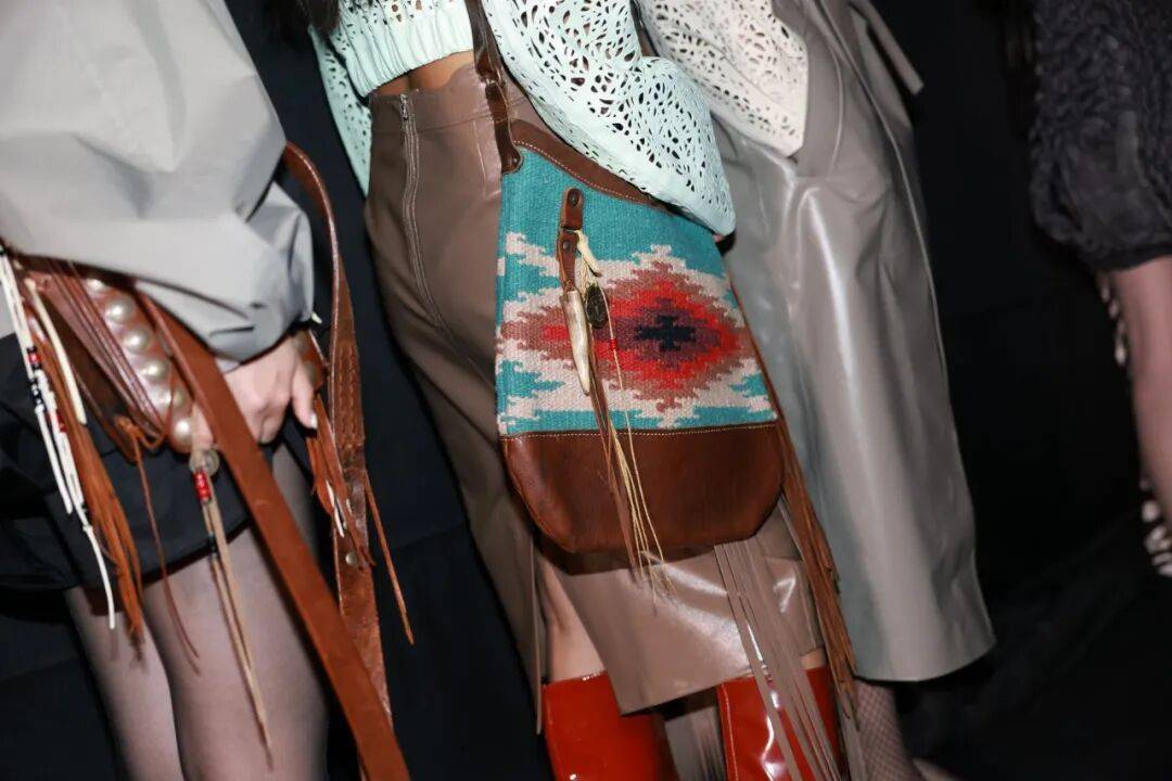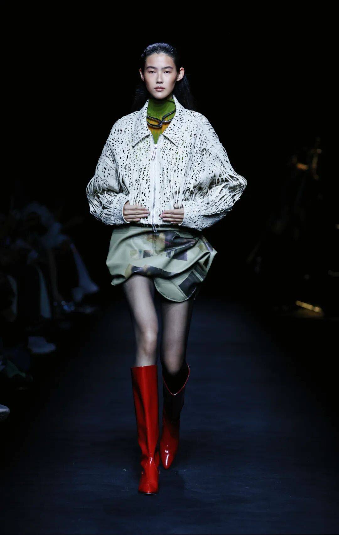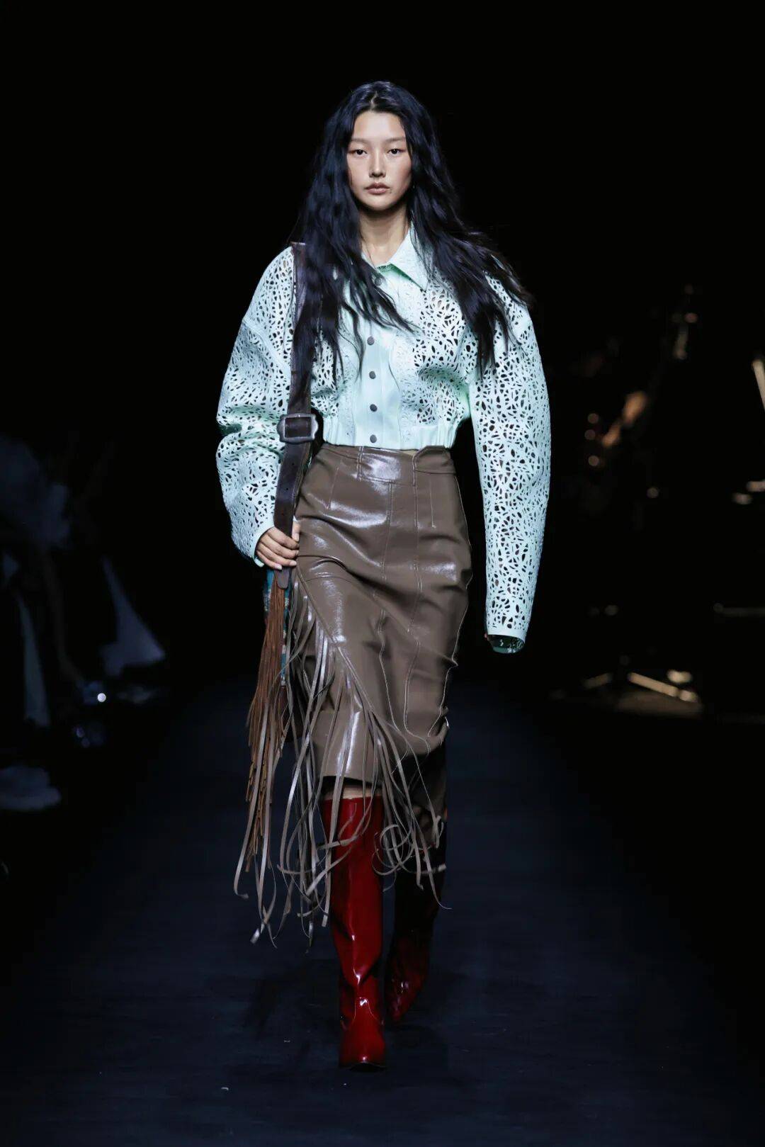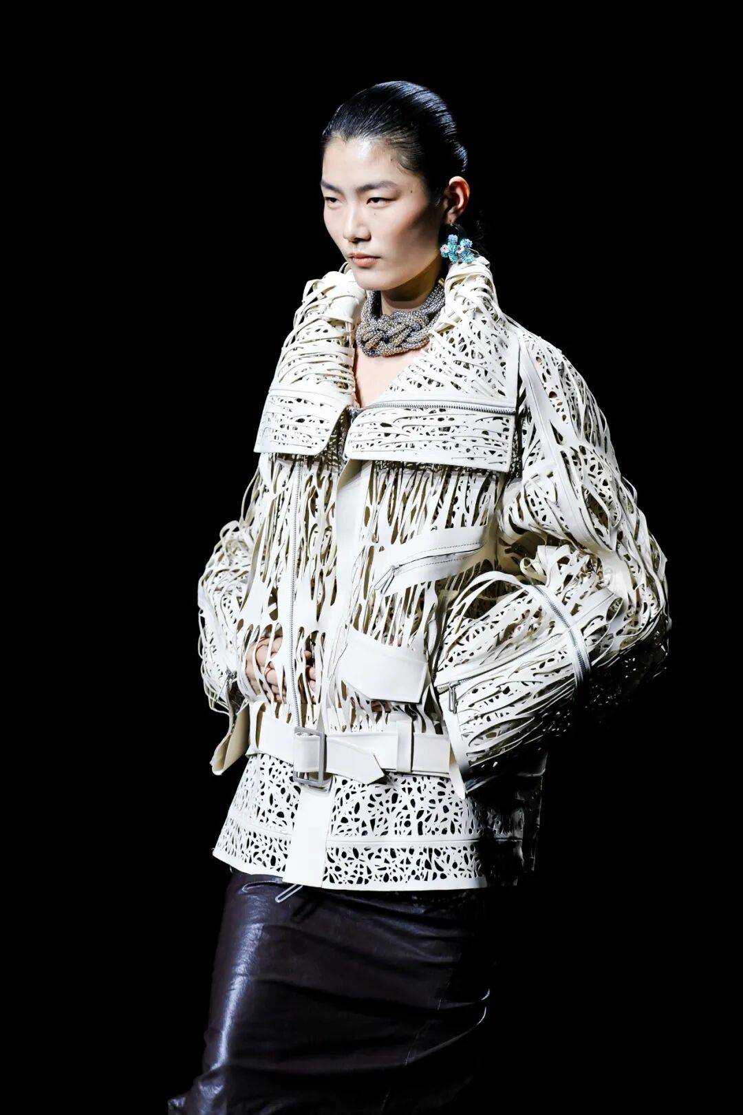 本季设计中,大廓形的biker jacket、bomber jacket和trench coat明显偏向实用主义。在前卫的表象之下,“Balance”平衡感和“Harmony”和谐感展现出设计师一如既往的扎实功底。流苏和绳子作为核心元素被反复运用,进行抽象或具象的表达。在草原上,绳子既是牛羊赖以生存的牧草,亦如牧民放牧的鞭子,缠绕着游牧生活的真实痕迹。而那松弛垂坠的绳态是生命的象征。