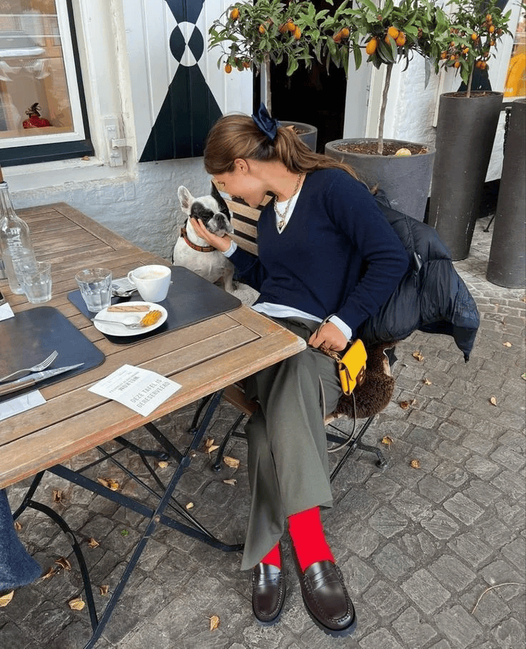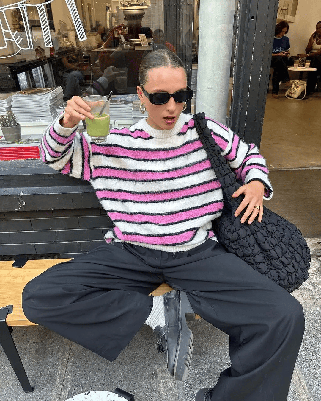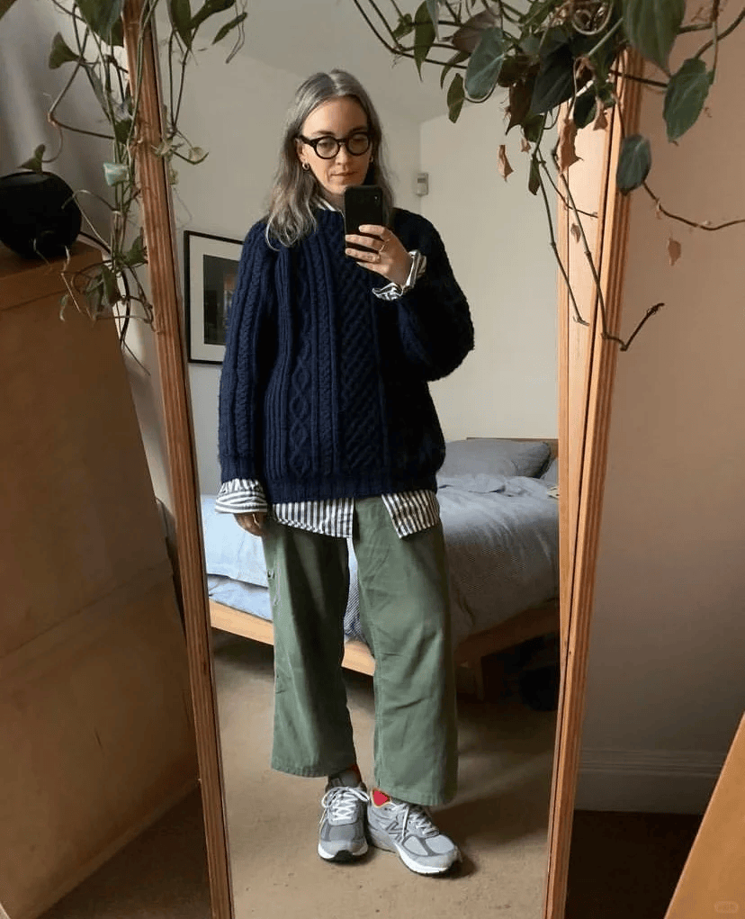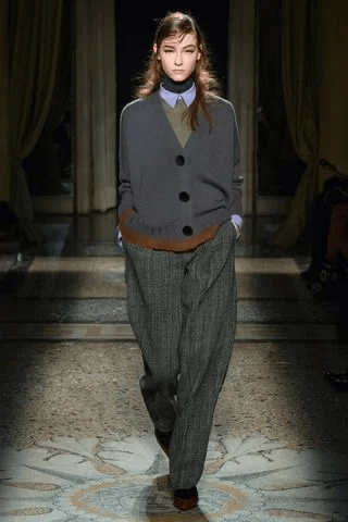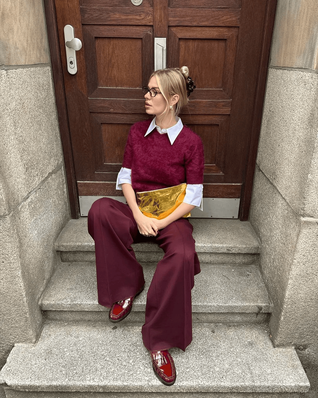 费尔岛毛衣+西装阔腿裤,繁简平衡,搭配乐福鞋更显干练。