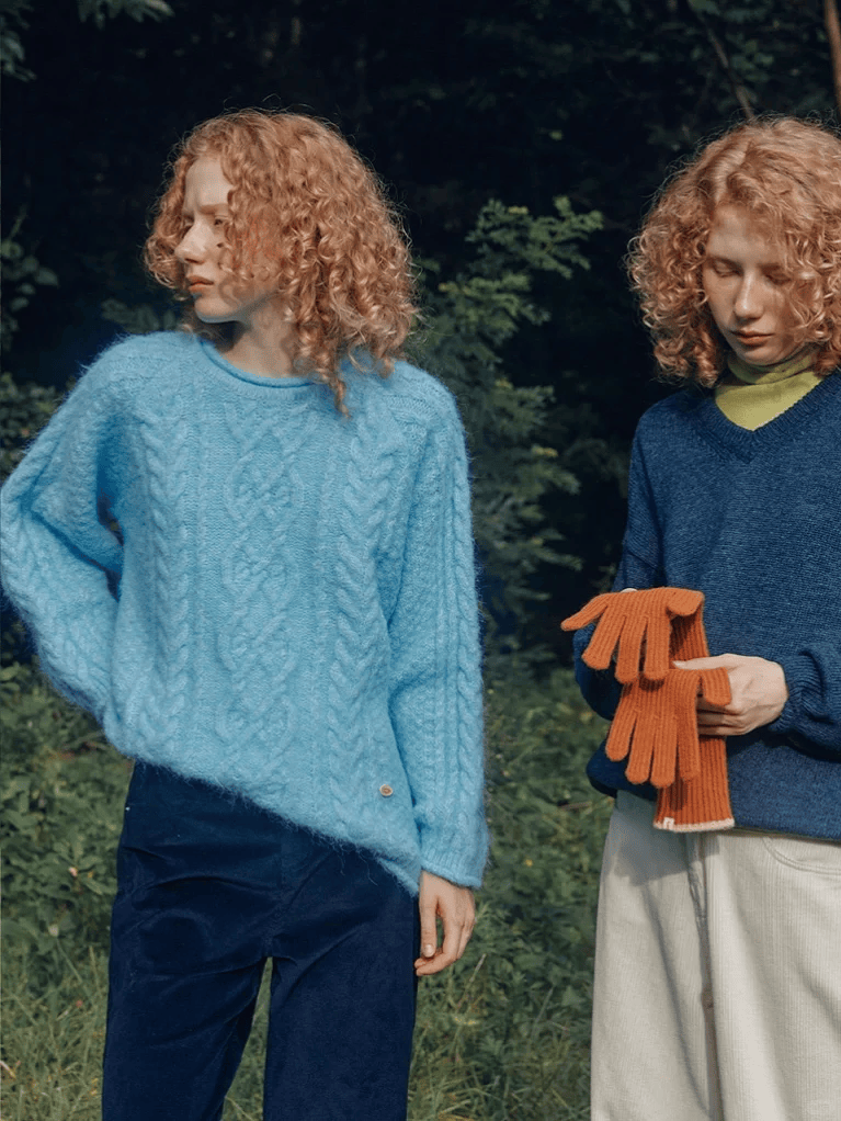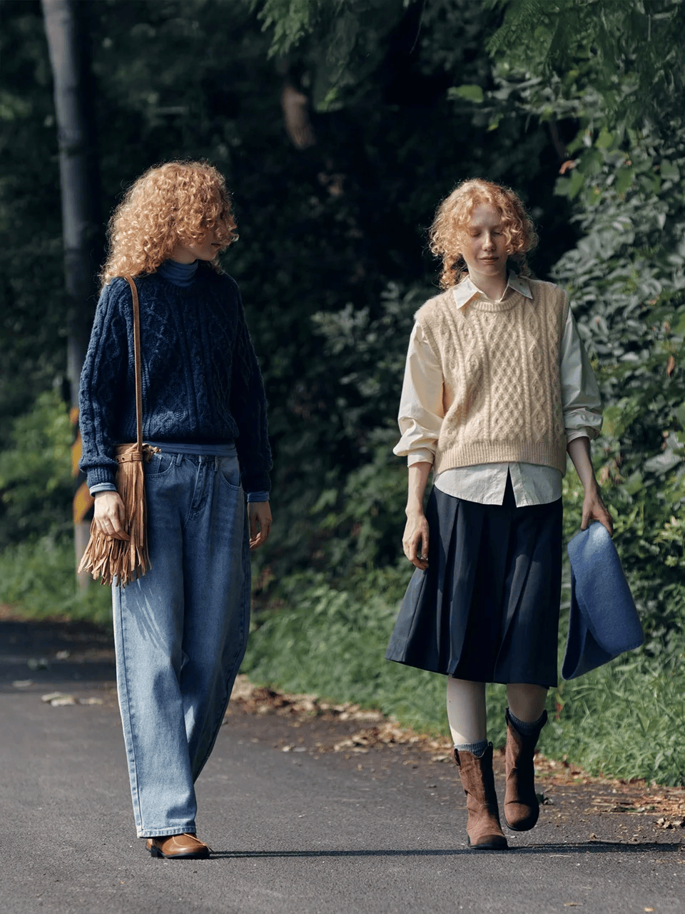 绞花/费尔岛元素:立体绞花纹复古温暖,费尔岛提花毛衣(局部图案款更易驾驭)增添北欧文艺感。