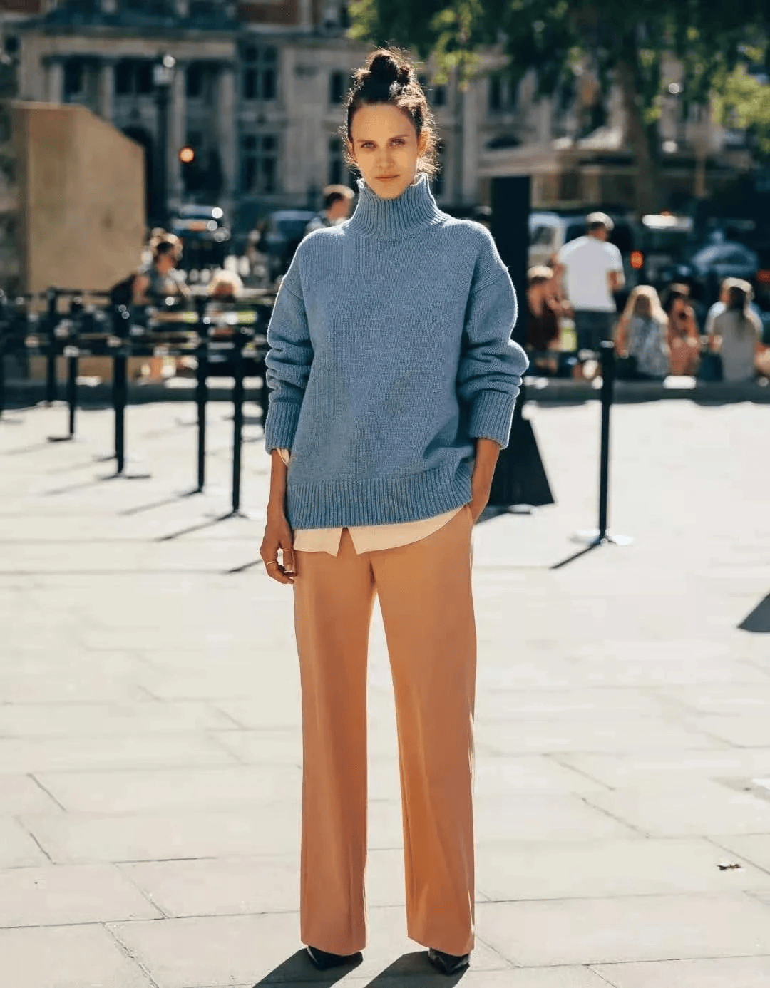 内长外短:高领打底+V领毛衣+阔腿裤,露出袖口或领口。