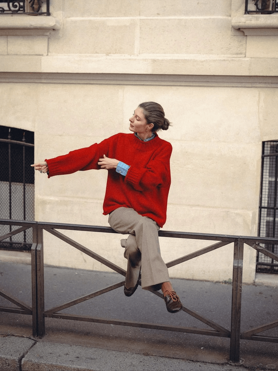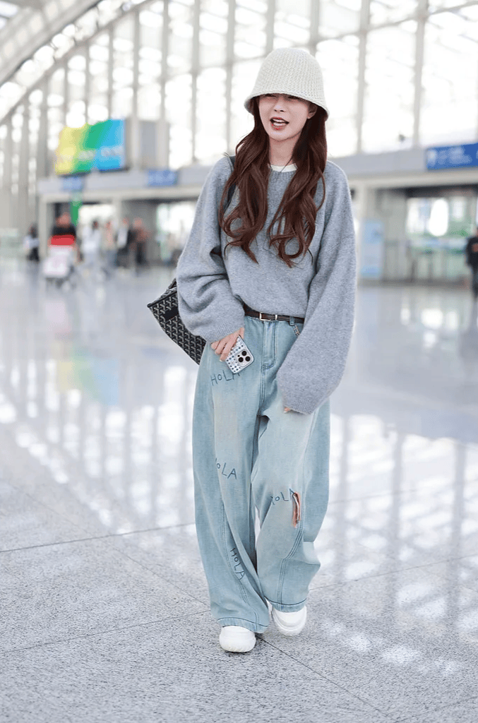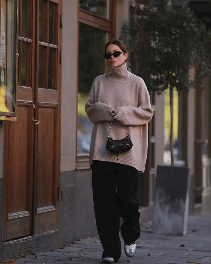 休闲街头风:oversize毛衣+束脚运动裤,配厚底鞋或马丁靴。