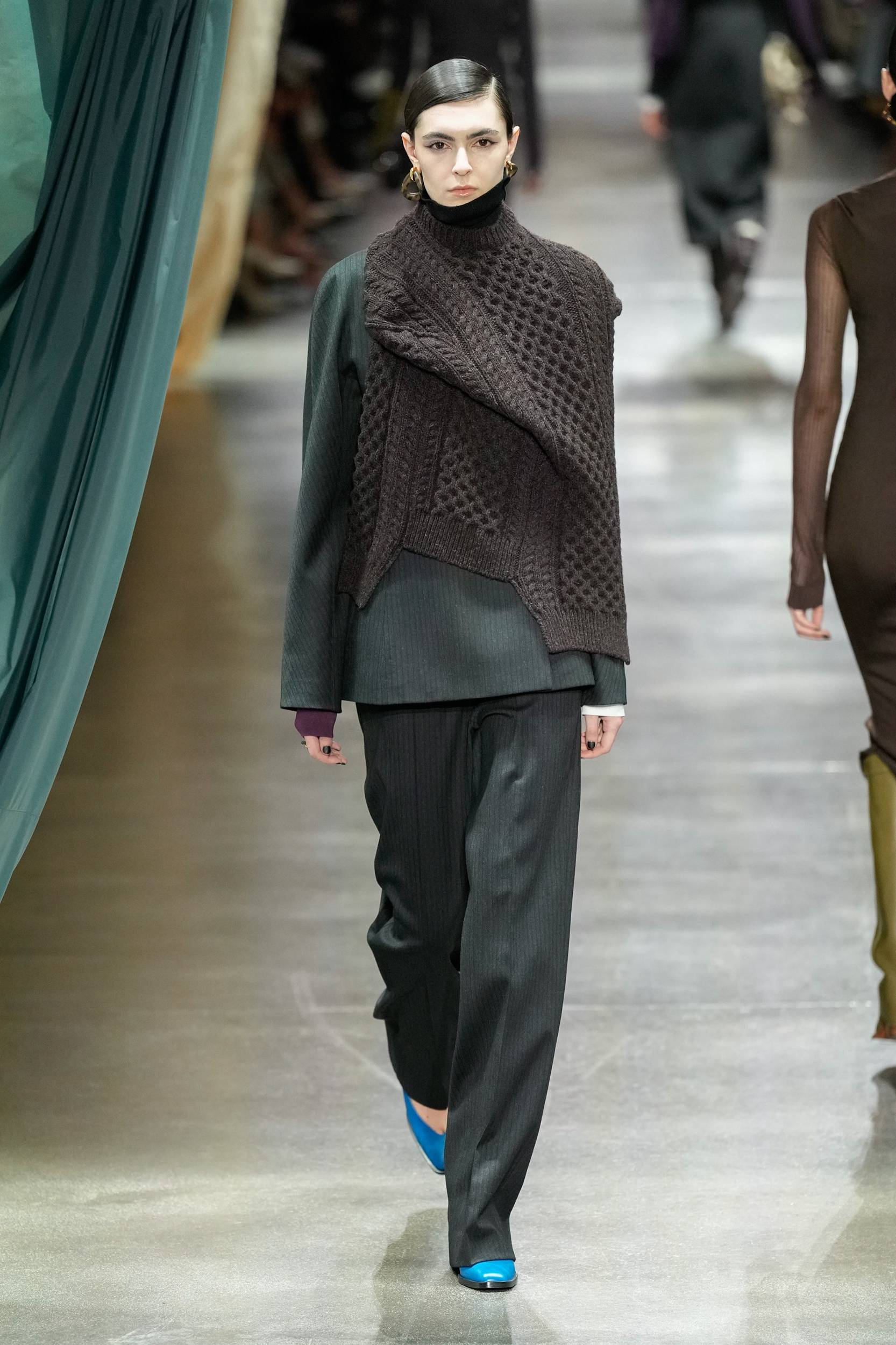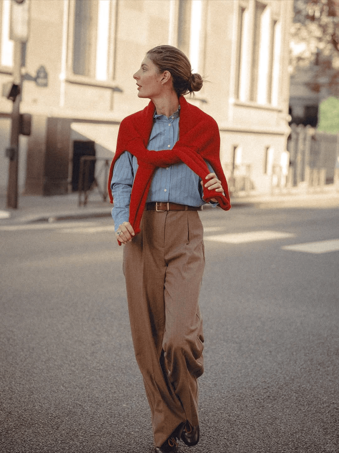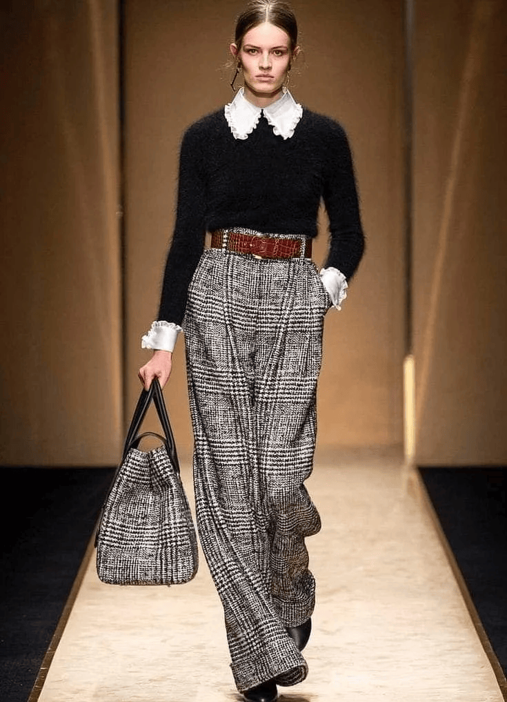 通勤高级感:正肩毛衣+垂感西装阔腿裤,尖头靴拉长线条。