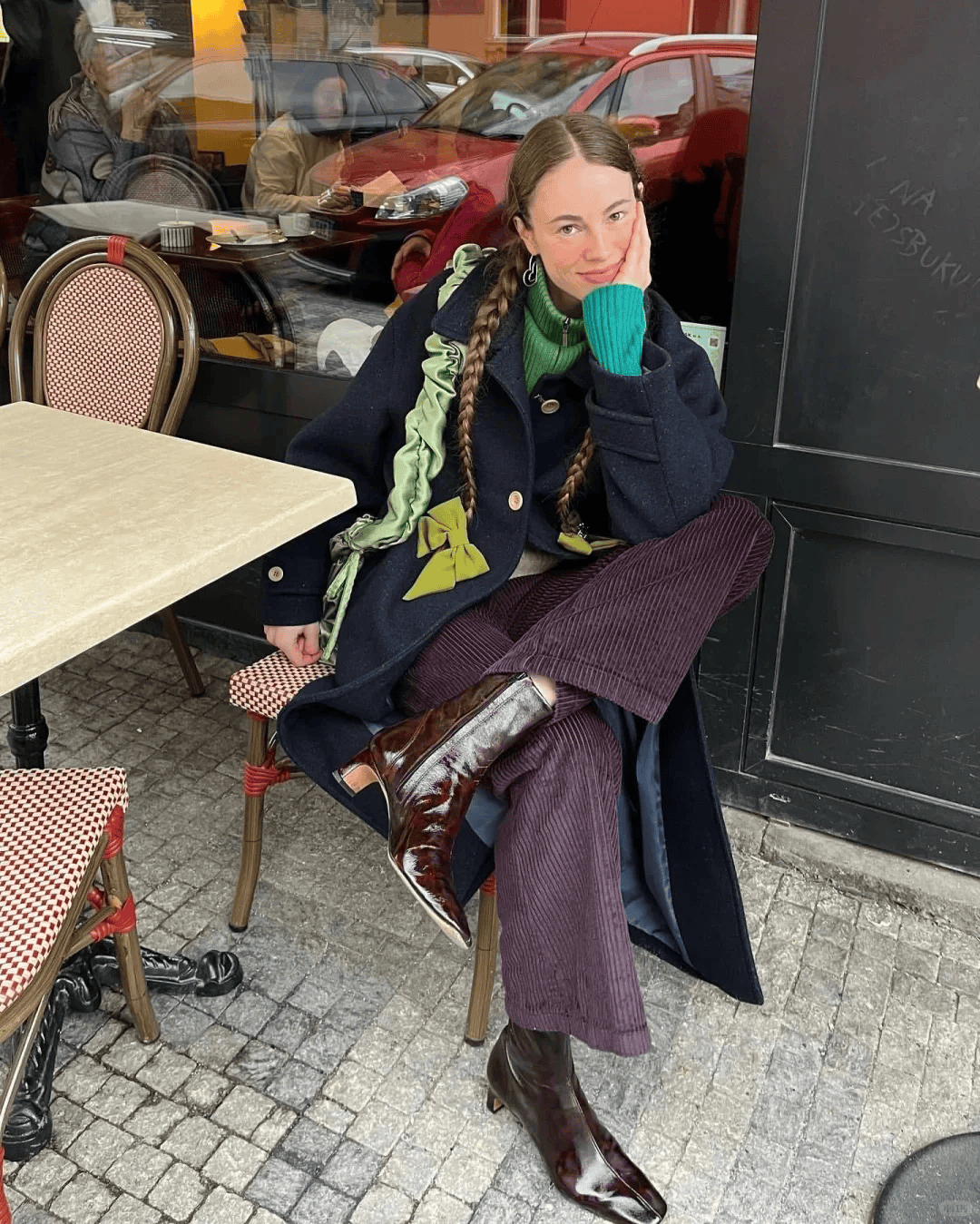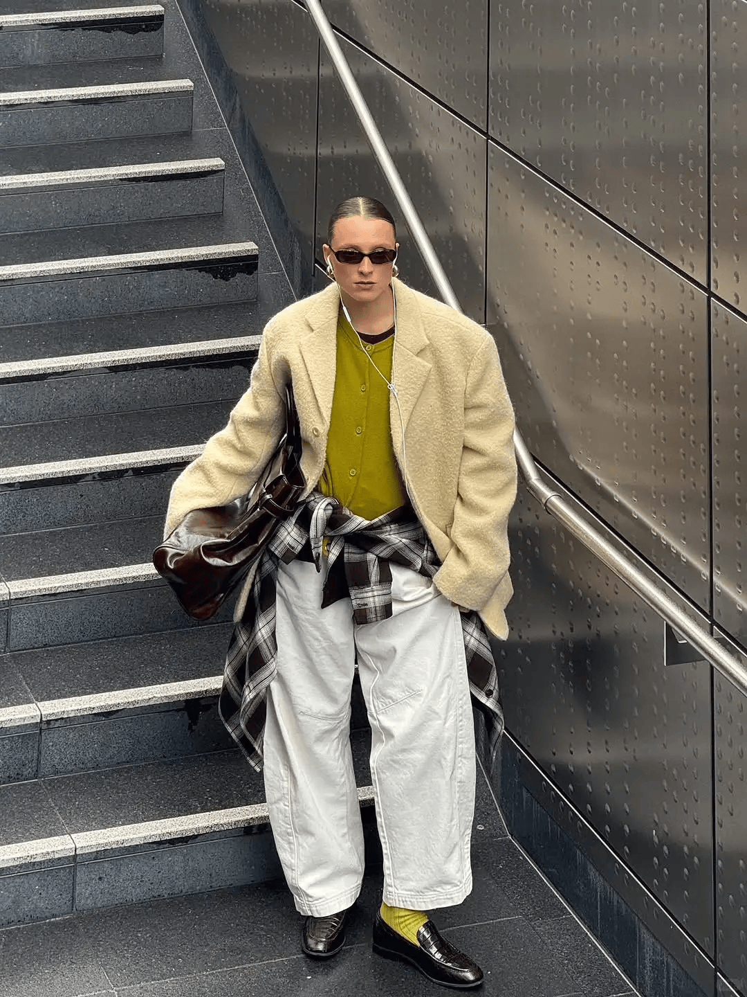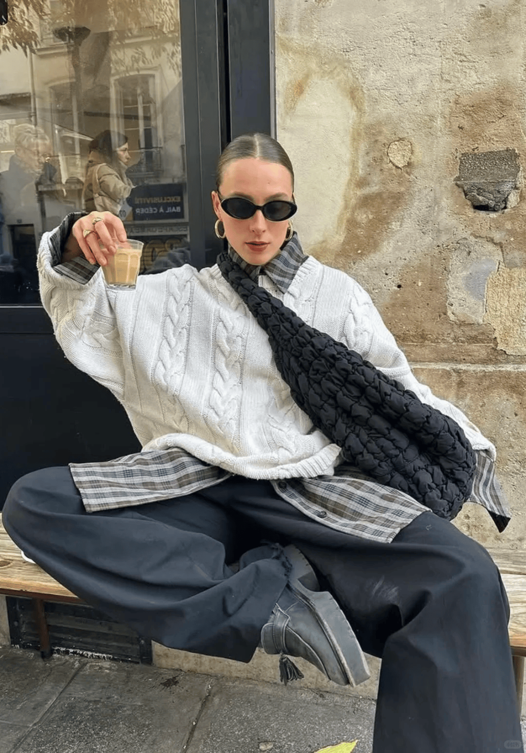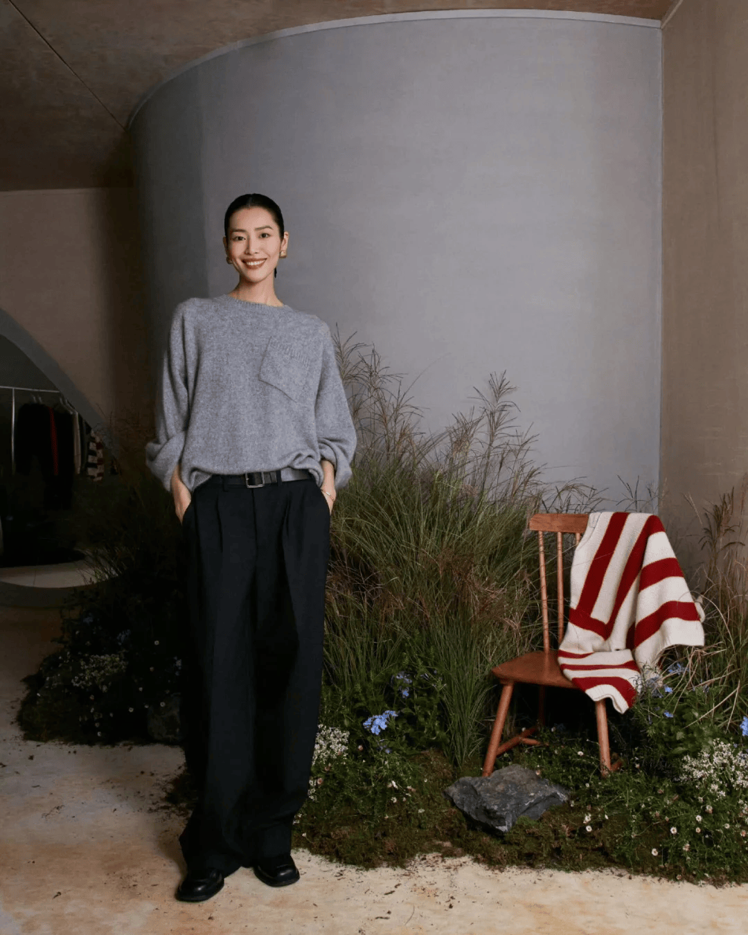 点睛细节:金属项链叠戴增加精致度,腰带强化腰线,中筒袜包裹脚踝延伸比例。冬日氛围靠材质说话,软糯羊毛与挺括牛仔的碰撞,正是慵懒与飒爽并存的精髓。