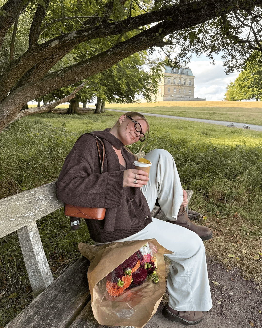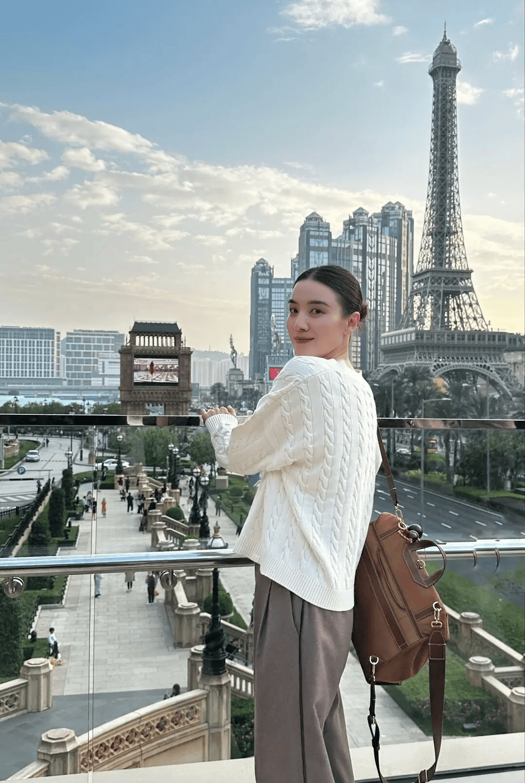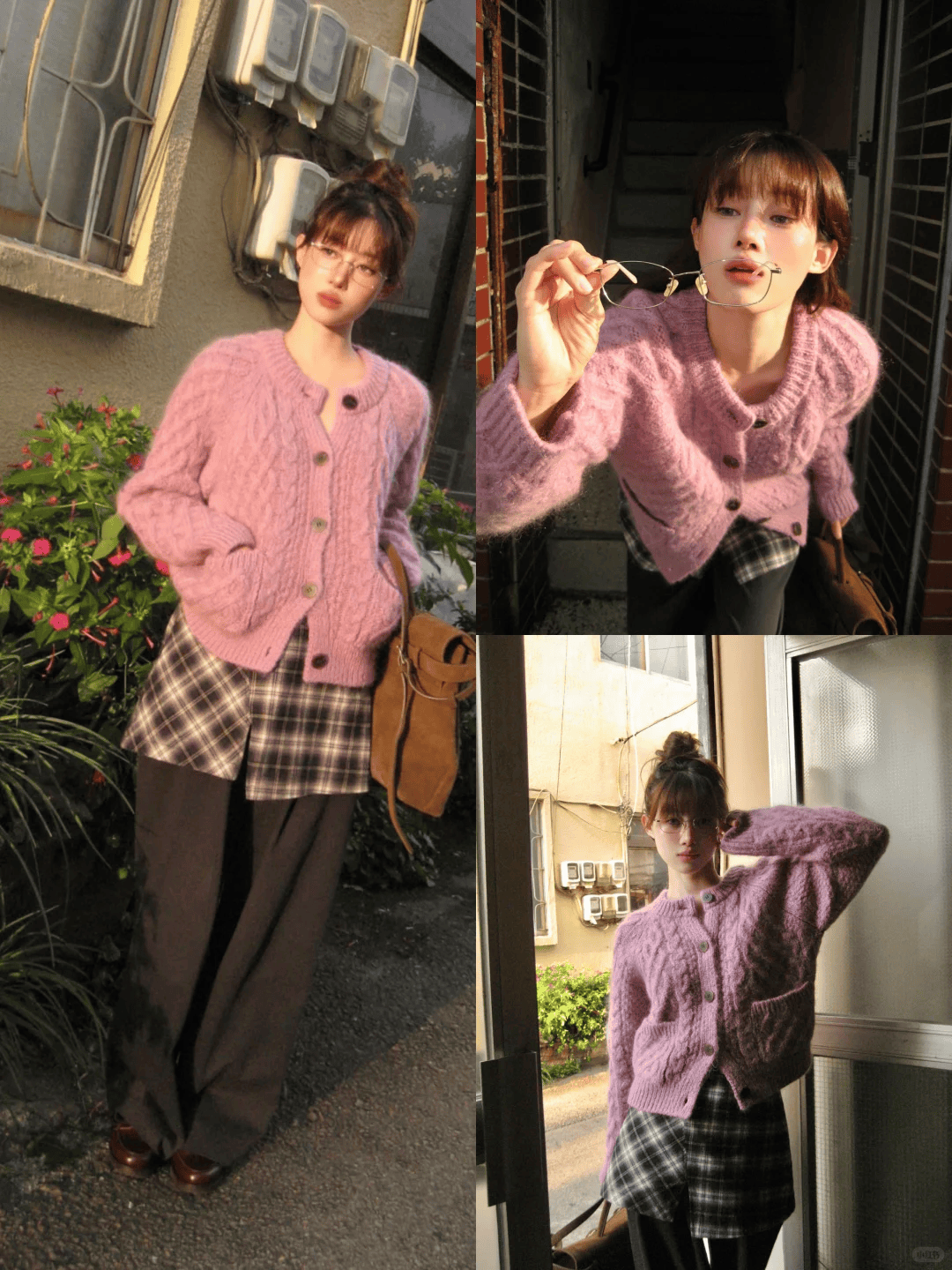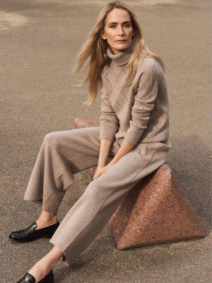 同色系显高级:驼色绞花毛衣+焦糖阔腿裤。