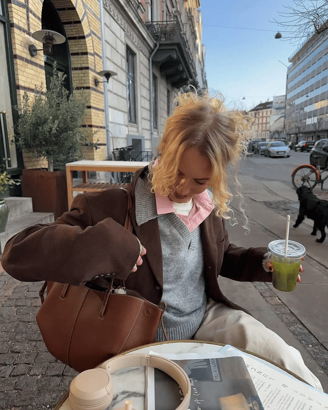 外套加持:皮夹克/大衣内搭同色系毛衣+阔腿裤,用亮色包袋提亮。