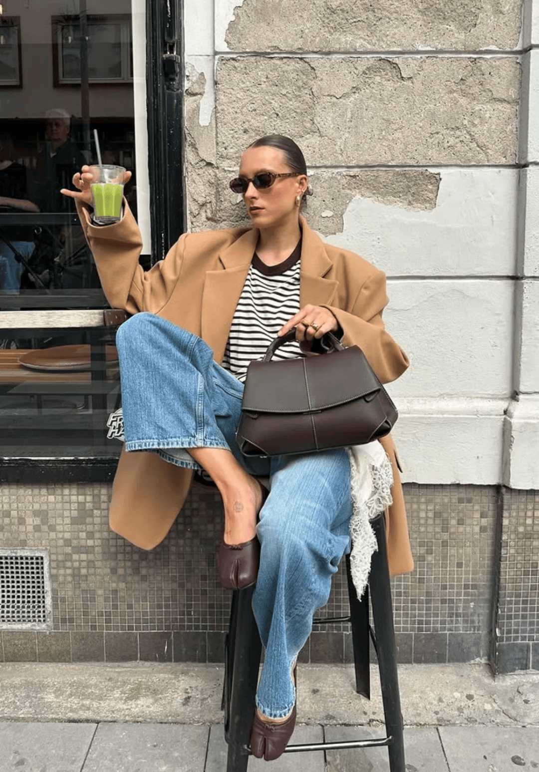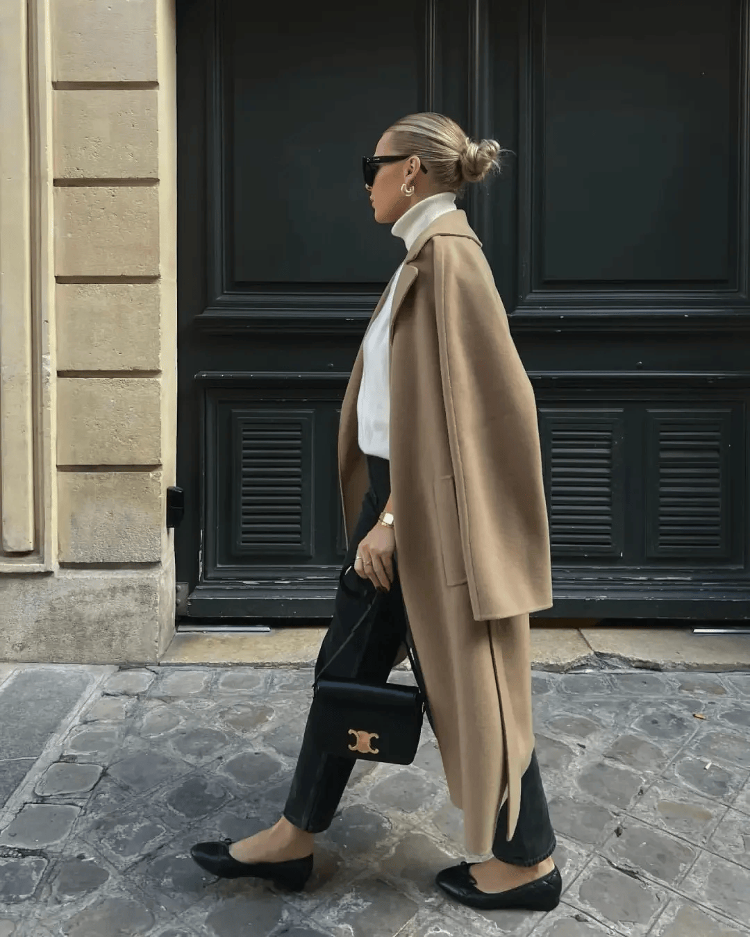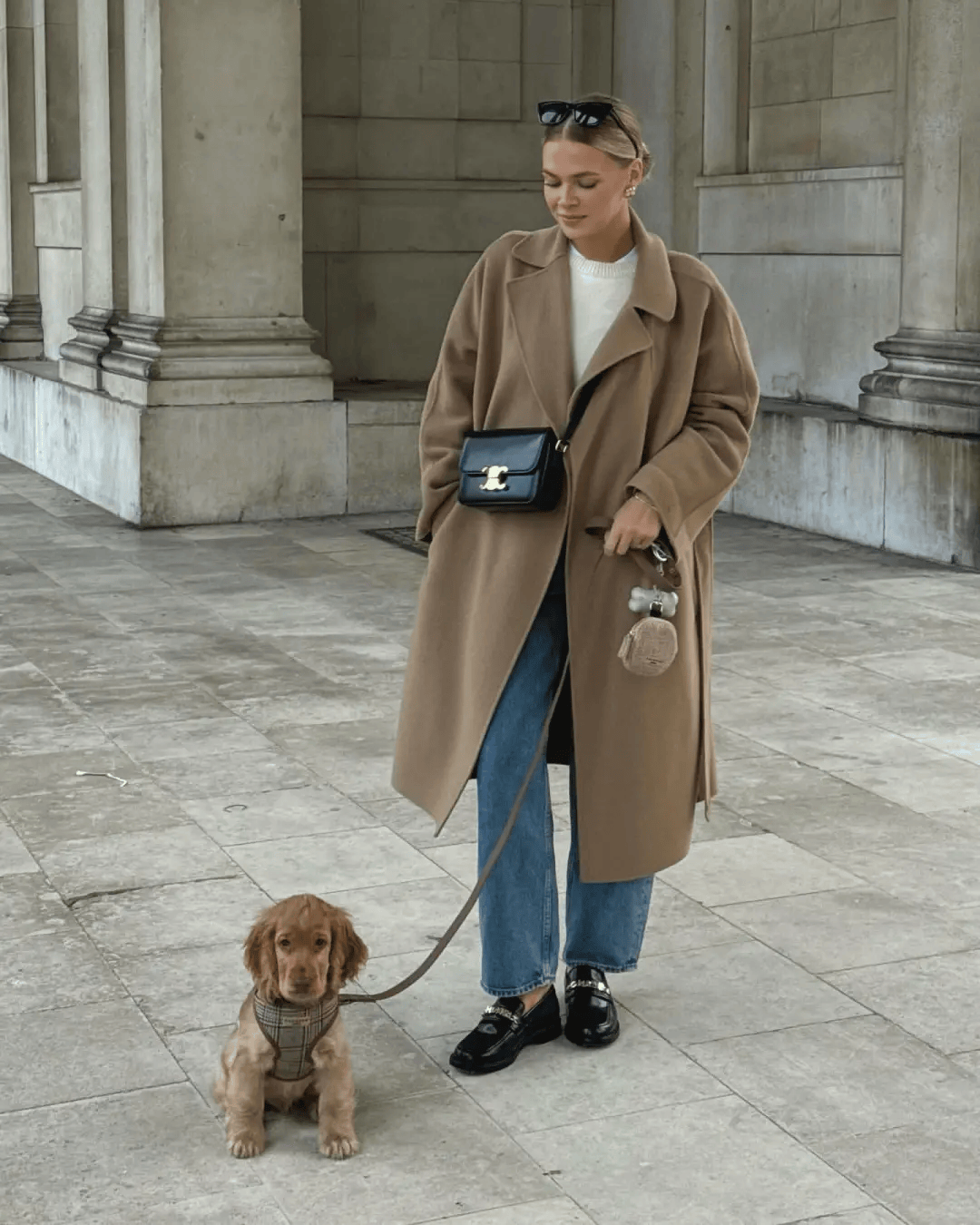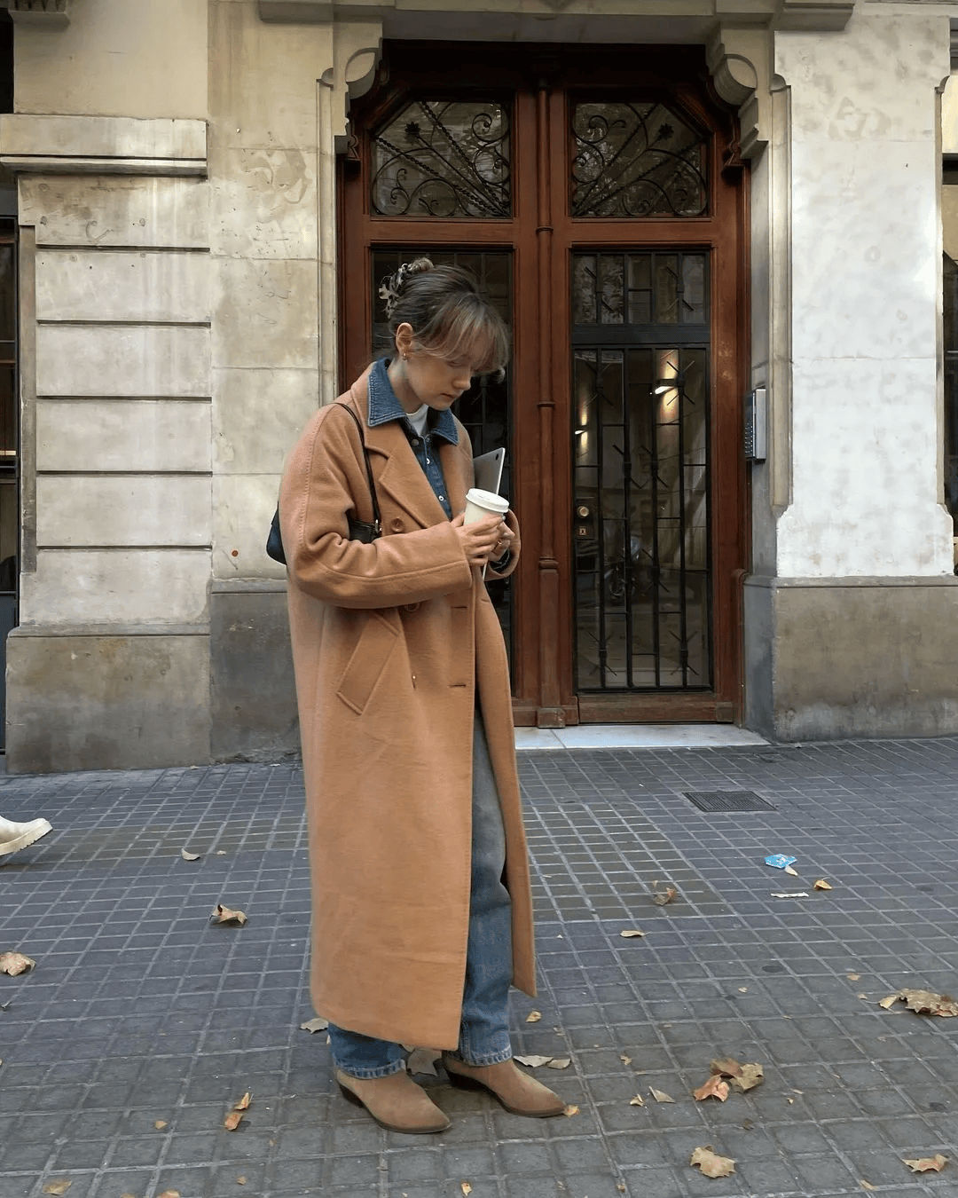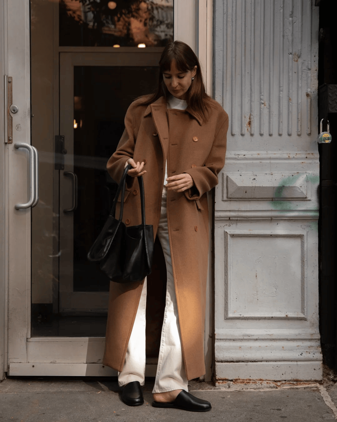 驼色大衣搭配白色毛衣 + 蓝色牛仔裤,再配黑色乐福鞋与黑色包包,蓝色牛仔裤的休闲感中和了大衣的正式感,乐福鞋增添精致度,松弛与利落完美平衡。