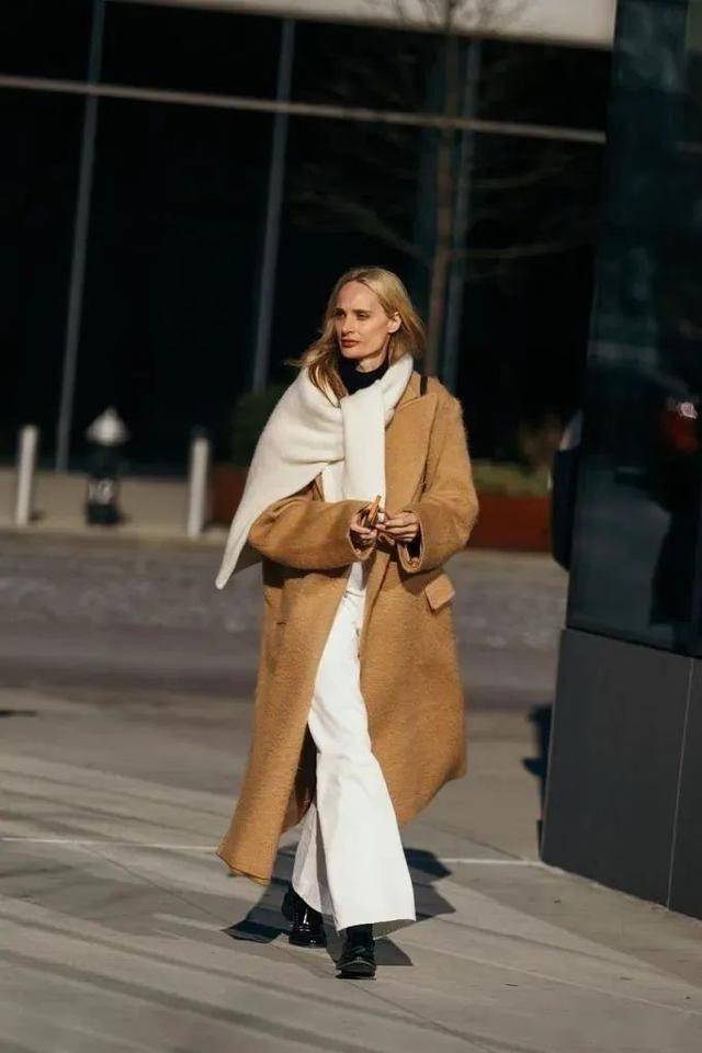 天气转凉时,加一条白色围巾再合适不过~ 既添了保暖度,又能和白色阔腿裤形成巧妙呼应,让顺色穿搭的细节更连贯。白色围巾中和了大面积驼色的厚重感,让整体造型更显清爽透气,不会显得沉闷。