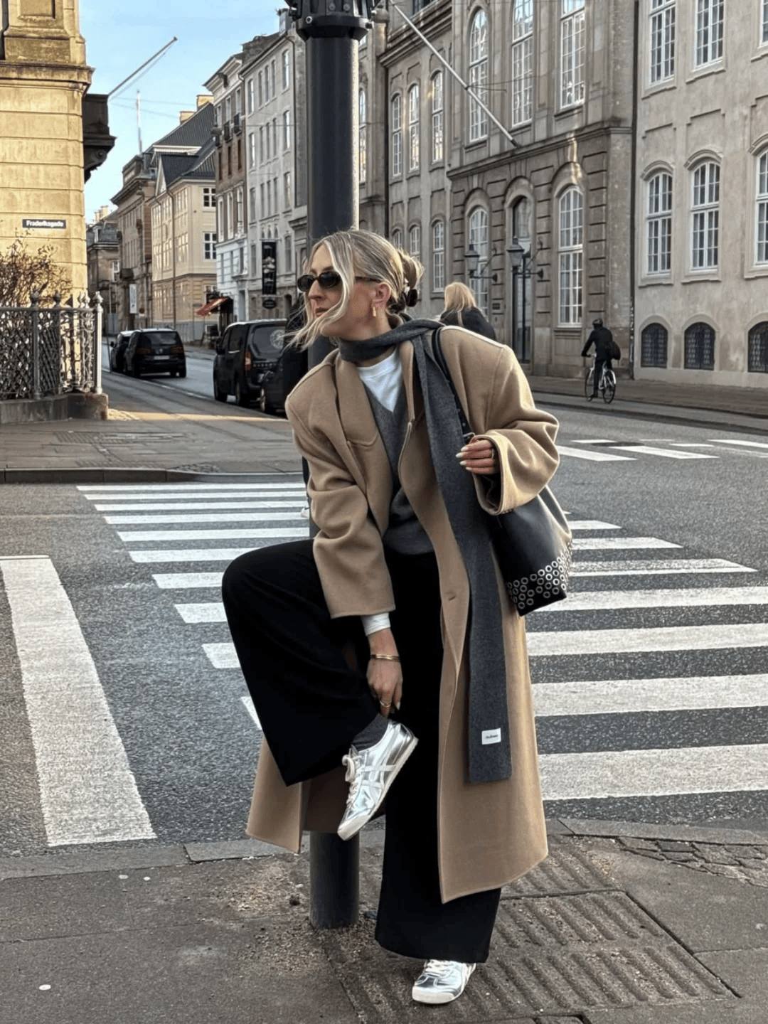 浅驼色大衣内搭灰色 V 领毛衣叠穿白色 T 恤,领口露出的白边增添层次感,清爽又不单调。搭配黑色阔腿裤平衡色调,再围一条灰色长围巾,与内搭毛衣呼应,让整体造型逻辑更连贯。